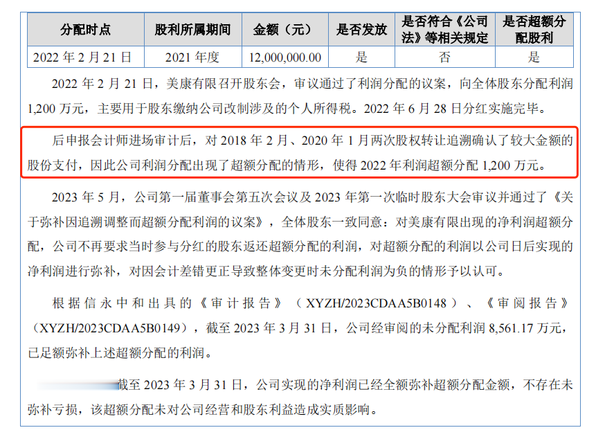 据招股书披露,2022年,美康股份实施了一次1200万元的现金分红。但审计师在进场后发现,由于公司前期未及时确认股权转让涉及的股份支付,导致会计差错调整,最终出现了“超额分配”的情形。换言之,公司在未准确核算自身可分配利润的情况下,便实施了分红。