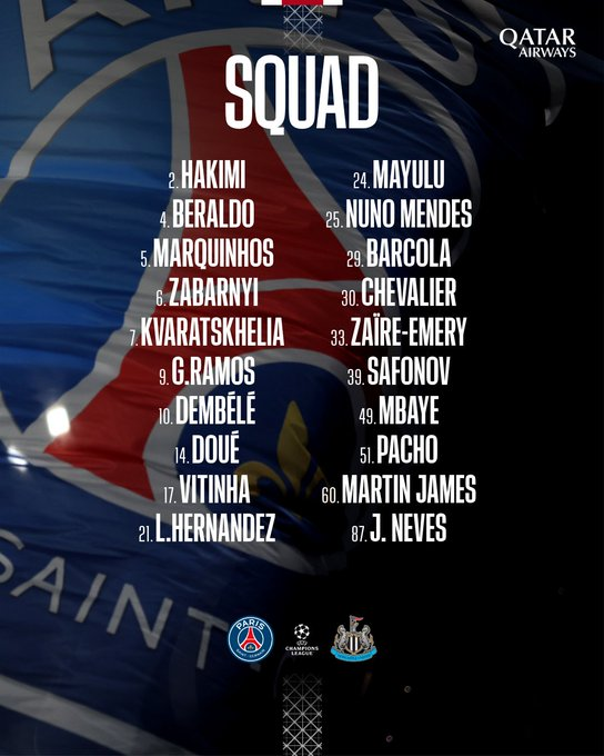 虎扑01月28日讯巴黎官方公布了本轮欧冠对阵纽卡的比赛大名单。