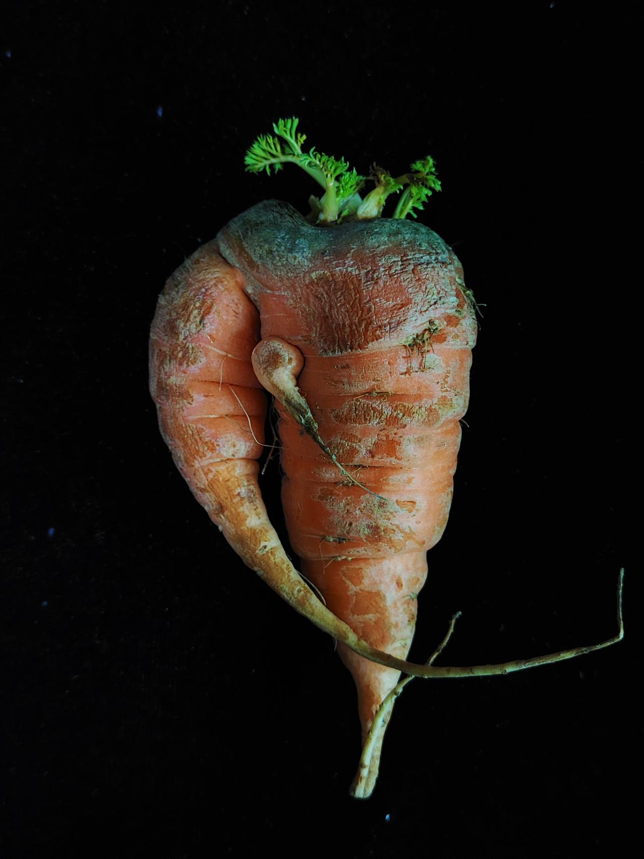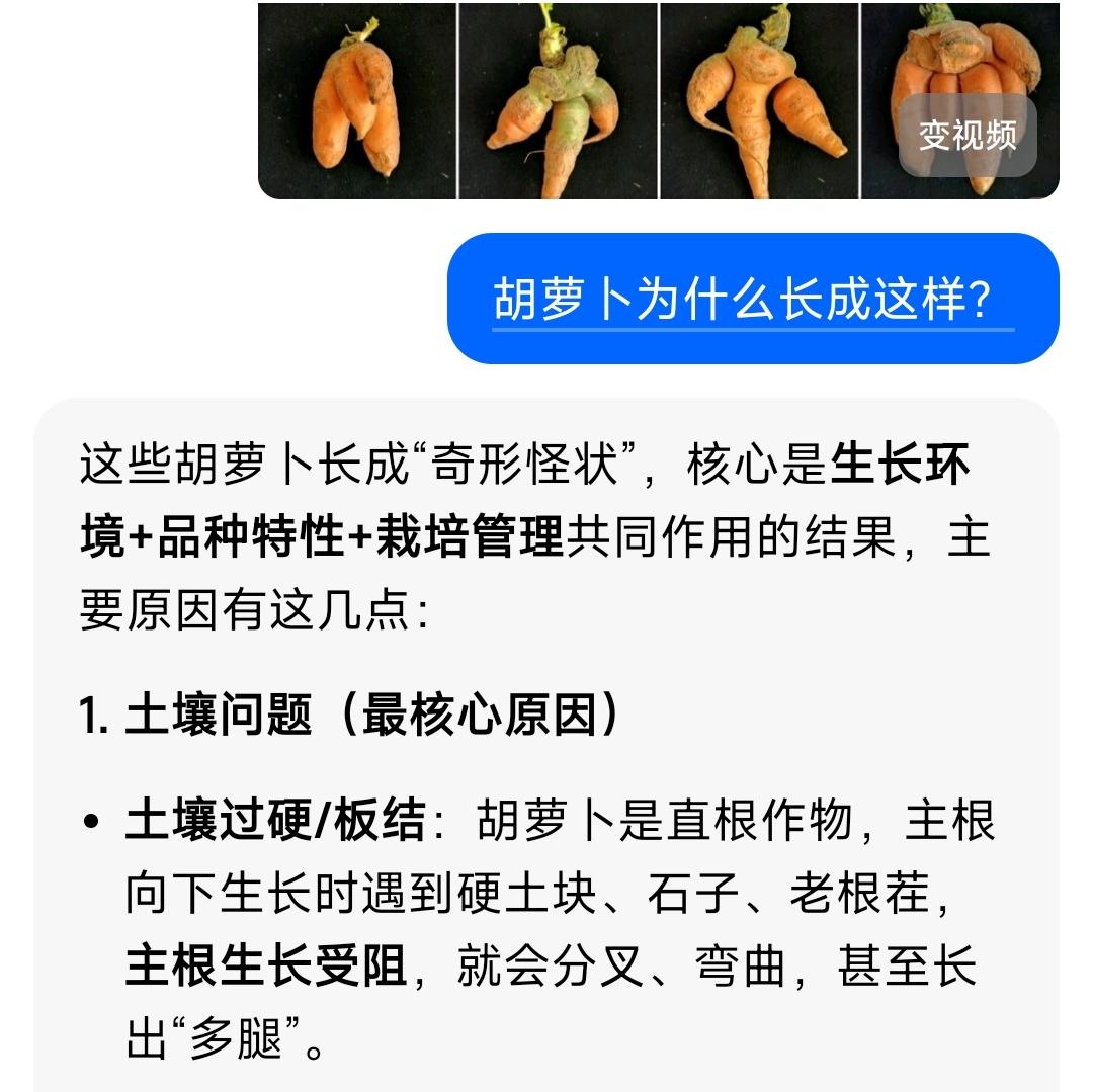 你知道胡萝卜为什么会长3条腿吗? 前些天从菜市场买了点一块钱1斤的胡萝卜。 正常的胡萝卜2块钱1斤。 这个便宜,因为长的歪瓜裂枣奇形怪状。 我问老板娘这是怎么回事? 她说,因为土地太硬了。 我刚刚去问了一下豆包,豆包也说是土地太硬了。 吃起来没问题。 我家有四只荷兰猪,我买回来是喂猪的。 当然,自己也可以吃。[呲牙] 刚买回来的时候吃着脆脆的,这会儿放了四五天,有点蔫了。 留着给猪吃吧。