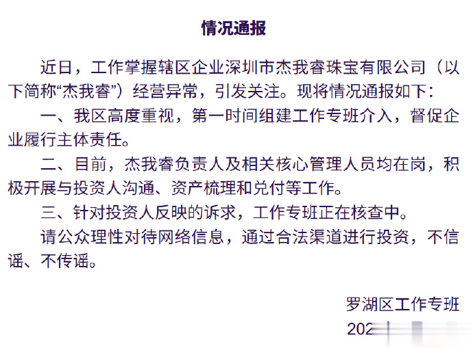 针对杰我睿珠宝经营异常,1月28日,罗湖区在官方微博“罗湖发布”中发布公告称,罗湖区高度重视,第一时间组建工作专班介入,督促企业履行主体责任。目前,杰我睿珠宝负责人及相关核心管理人员均在岗,积极开展与投资人沟通、资产梳理和兑付等工作。针对投资人反映的诉求,工作专班正在核查中。