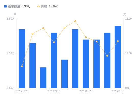 日期A股户数(户)流通A股户均持股数(股)户均持股市值(万元)2026-01-208100036930.9847.572026-01-108300036041.0747.112025-12-318100036930.9843.582025-11-307900037865.9449.382025-11-207900037865.9450.782025-10-318200036480.6053.992025-09-307322040855.0858.182025-09-108100036930.9847.862025-08-107100042132.5259.832025-07-317800038351.4052.62