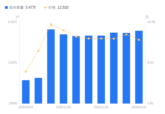 日期A股户数(户)流通A股户均持股数(股)户均持股市值(万元)2026-01-205469312604.6715.782026-01-095336412918.5817.522025-12-315358312865.7816.402025-11-305172913326.9017.032025-11-285172913326.9017.032025-11-205145713397.3417.602025-11-105252013126.1818.902025-09-305553412413.7919.292025-06-302575226557.9227.542025-03-312432029732.0918.67