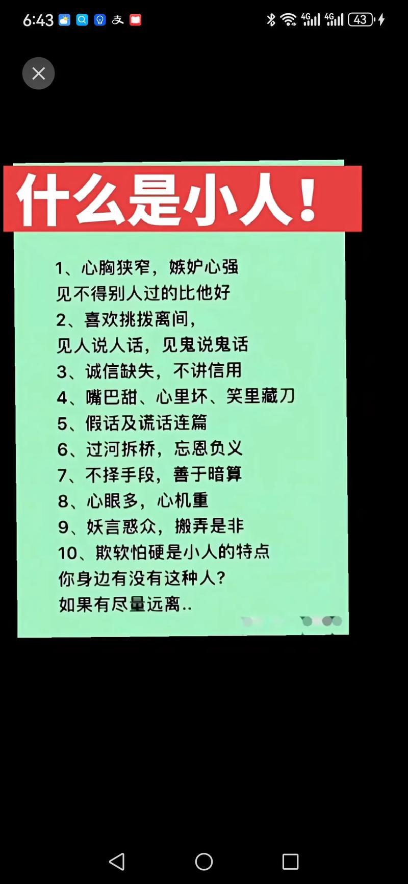 跟小人相处:3句金句定规矩,不翻脸不惹祸,还能保自己 核心:不远不近,不冷不热,不深交不树敌 1. 面上过得去,心里划清界 不跟小人争口舌、较输赢,表面保持基本礼貌,不轻易表露喜恶;私下绝不谈私事、吐心声,守住自己的边界和底牌。 2. 小事不计较,大事不让步 鸡毛蒜皮的小事别纠缠,避免被小人揪着把柄借题发挥;触及原则、利益的大事,态度坚定不妥协,让对方知道你有底线不好惹。 3. 少打交道,不共利益 尽量减少无必要的往来,不跟小人合作共事、牵扯金钱利益;若避不开,凡事留证据、讲规矩,不给他留钻空子的机会。 总结: ✅ 逢人只说三分话,未可全抛一片心 ✅ 宁得罪君子,不得罪小人 ✅ 敬而远之,是对小人最好的回击 处人处事准则 处人处事准则 小人的几大表现 处人处世技巧