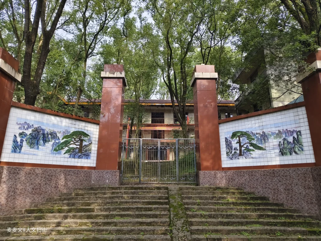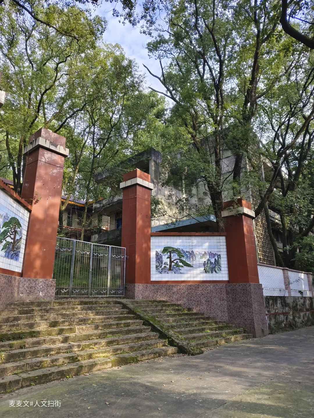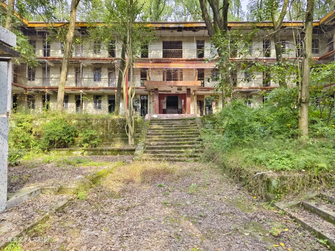 这片始建于1952年的老建筑群,位于重庆市北碚区东阳街道西山坪村。红砖立柱的大门嵌着“巴山★津诚”的字样,门后是爬满青苔的石阶,通向一栋带着铁栏窗的老楼,这里正是当年九大队的旧址。 原所办公楼斑驳的马赛克墙面上,迎客松瓷画还留着当年的鲜亮,废弃的值班室窗口挂着褪色红布,在风里轻轻晃。从最初的农场到后来的职能转型,老建筑里藏着几代人的痕迹。 如今,山林间的蝉鸣盖过了过往声响,落叶铺满无人的台阶,只有红砖墙、旧瓷砖壁画和生锈的铁窗,在阳光里静静讲述着西山坪的岁月变迁。