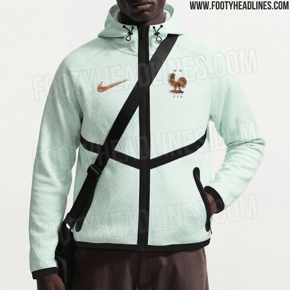 耐克设计的法国队2026年客场网眼夹克呈现出更加清新的视觉效果,采用薄荷绿和浅绿色配色,与此前泄露的客场球衣颜色一致。与主场版本相同,队徽与标志均采用金属质感设计,营造出高级质感。