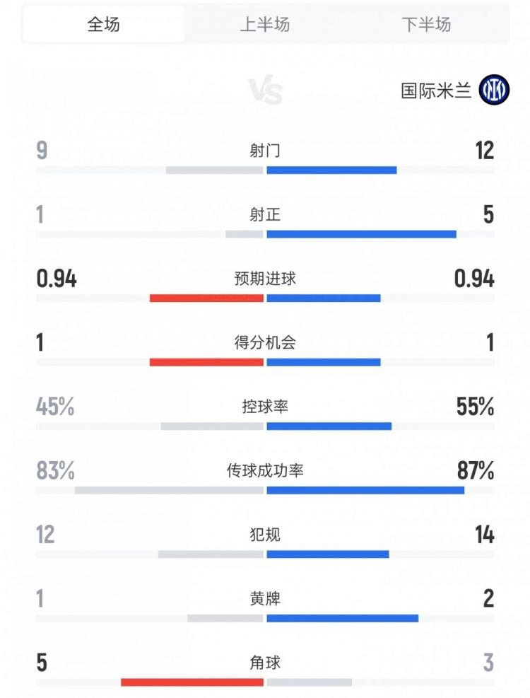 多特vs国米全场数据:射门9比12、射正1比5、控球率45%比55%