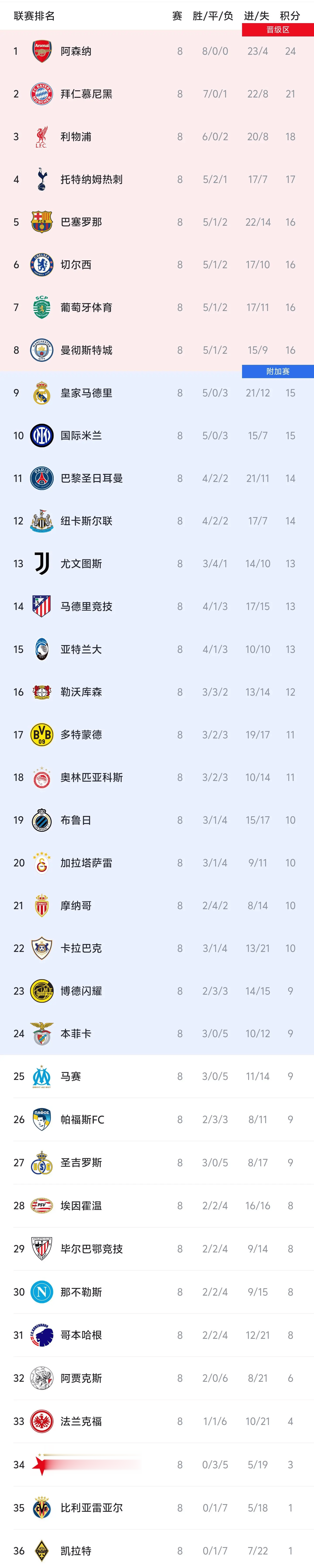 虎扑01月28日讯欧冠联赛阶段全部结束,阿森纳、拜仁慕尼黑、利物浦、托特纳姆热刺、巴塞罗那、切尔西、葡萄牙体育、曼城获得了前八名,直接晋级16强。