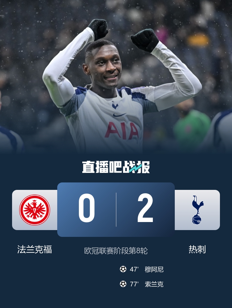 直播吧01月29日讯欧冠联赛阶段第8轮战罢,热刺2-0力克法兰克福,以联赛阶段第4的成绩直通15强。球队在本届欧冠联赛阶段8轮5胜2平1负。