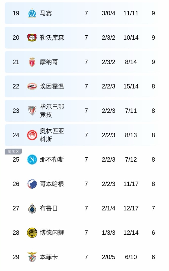 直播吧01月29日讯欧冠小组赛第7轮结束后,马赛9分、0净胜球排名第19位,本菲卡6分、-4净胜球排名第29位。