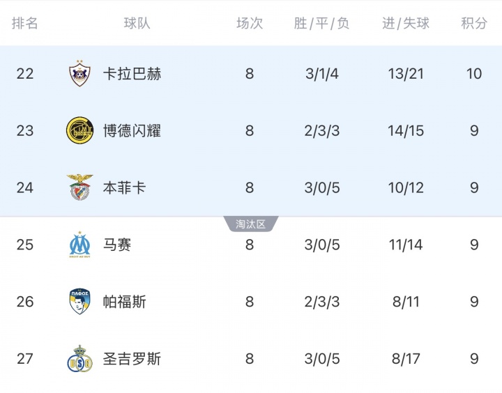 最后一轮风云突变。马赛0-3不敌布鲁日,最终积分位9分、-3净胜球。本菲卡4-2绝杀皇马,最终积分位9分、-2净胜球。