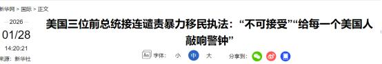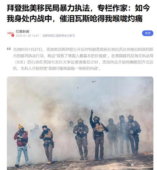 出大事了,美国爆发混乱后,三大人物果断出山,更麻烦的还在后面   谁能想到,这个以湖泊风光闻名的州,如今靠两场血案彻底“出圈”,还把美国政坛搅得天翻地覆——曾经谁都敢怼的特朗普突然低头认怂,三位重量级人物趁机出山坐镇,而更棘手的乱子还在后头。   事情的导火索是两条人命。1月7日那天,明尼阿波利斯市的街头突然响起枪声,移民与海关执法局(ICE)的人在抓捕非法移民时,一枪打死了正在开车的37岁美国女子蕾恩·妮科尔·古德。   这事刚让当地人压下火气,短短三周后的1月24日,又一声枪响炸响:37岁的重症监护室护士亚历克斯·普雷蒂被联邦执法人员当场击杀在街头。二十多天里两条无辜性命栽在自家执法者手里,明尼苏达的老百姓彻底被激怒了。 最先站出来的是普通民众。   23日那天,当地工会和社区联手发起抗议,几百名机场工作人员跟着宗教人士堵在机场门口,光是穿教袍的抗议者就抓了100多个。到了下午,联邦机构大楼外更热闹,抗议者直接躺在马路上封路,和戴防暴盾的警察对峙,催泪弹的烟雾混着民众的呐喊飘出好几条街。   据组织者统计,当天全州700多家商户主动关门声援,连平时忙着赚钱的小老板都攥着标语站到了街头:“我们不是待宰的羔羊!” 民众的怒火还没烧到顶点,美国政坛的“三大巨头”就果断出山了。   前总统拜登率先在社交媒体上开炮,直接骂联邦执法是“背叛基本价值观”,喊着要搞“全面、公正的调查”,还鼓动更多美国人站出来抗议,明着跟特朗普政府叫板。紧接着,克林顿和奥巴马也接连发声,三个前总统凑一块儿谴责执法暴力,这在近几年的美国政坛实属罕见。   他们的表态像给抗议浪潮添了把火,原本只在明尼苏达闹腾的示威,很快蔓延到加州、纽约等十几个州,连护士群体都举着“停止ICE暴行”的牌子上街了。 这架势彻底打懵了特朗普。   要知道,就在一周前,他还在社交媒体上痛骂明尼苏达州州长沃尔兹“腐败又无能”,威胁要抓人家去坐牢。可面对愈演愈烈的抗议和三大前总统的联手施压,这位向来强硬的总统突然软了下来。   26日,他偷偷给沃尔兹和明尼阿波利斯市市长弗雷打了电话,挂了之后还特意发推说“聊得很投机,我们看法一致”。没过两天,他又公开宣布联邦执法要“稍微放松一些”,还把之前指挥行动、扔催泪弹惹了众怒的边境巡逻队负责人博维诺给撤了,换了个“更懂缓和局势”的汤姆·霍曼接手。   最重要的是,之前他的幕僚还造谣普雷蒂是“本土恐怖分子”,结果特朗普转头就否认,明摆着跟下属划清界限。 特朗普的怂,本质上是扛不住现实的耳光。   益普索和路透社的民调早就给出了答案:现在只有39%的人支持他的移民政策,创下他第二任期以来的新低,58%的人都觉得联邦执法“做得太过头”,连不少共和党支持者都翻了脸。   更重要的是,共和党人克里斯·马德尔直接宣布退出明尼苏达州长竞选,理由说得很直白:“政府这破事把民心都败光了,共和党根本赢不了”。眼看中期选举要来了,特朗普再硬扛下去,恐怕连自己的基本盘都要崩。 但明眼人都看得出来,特朗普这波“降温”根本解决不了问题。   表面上他撤了个指挥官,可还是放话说“执法不会停,以后还要扩展到其他城市”;嘴上答应让明尼苏达调查枪击案,暗地里却派霍曼带着更隐蔽的手段继续执法。   更麻烦的是,这已经不是明尼苏达第一次因为警察开枪闹翻天了,2021年非洲裔男子赖特被枪杀的伤疤还没好,2024年又出了警察和消防员被打死的枪击案,如今执法暴力再添新血债,民众对政府的信任早就碎成了渣。   更可怕的是潜藏的分裂危机。现在联邦政府和地方已经闹得水火不容,弗雷市长直接放话“绝不帮着执行违宪逮捕”,特朗普却警告人家“在玩火”。两党更是把这事当成了博弈的筹码:民主党靠着抗议攒人气,共和党内部却吵成一团,连参议院领袖都公开和特朗普唱反调。   这种撕裂可不是换个指挥官、松几天执法就能弥补的,搞不好下次再出点事,就不是街头抗议那么简单了。 说到底,明尼苏达的乱局就是美国社会的一面镜子:执法系统的暴力倾向、两党斗争的愈演愈烈、政府与民众的信任崩塌,这些问题早就在那儿生根发芽。   特朗普的低头认怂不过是权宜之计,三大前总统的发声也更像政治秀,要是不真刀真枪改革执法体系、弥合社会裂痕,这锅粥只会越搅越浑。接下来的中期选举要是再借着这事煽风点火,美国怕是真要迎来更难收拾的局面,毕竟民意这东西,一旦被点燃,可不是随便说说就能浇灭的。