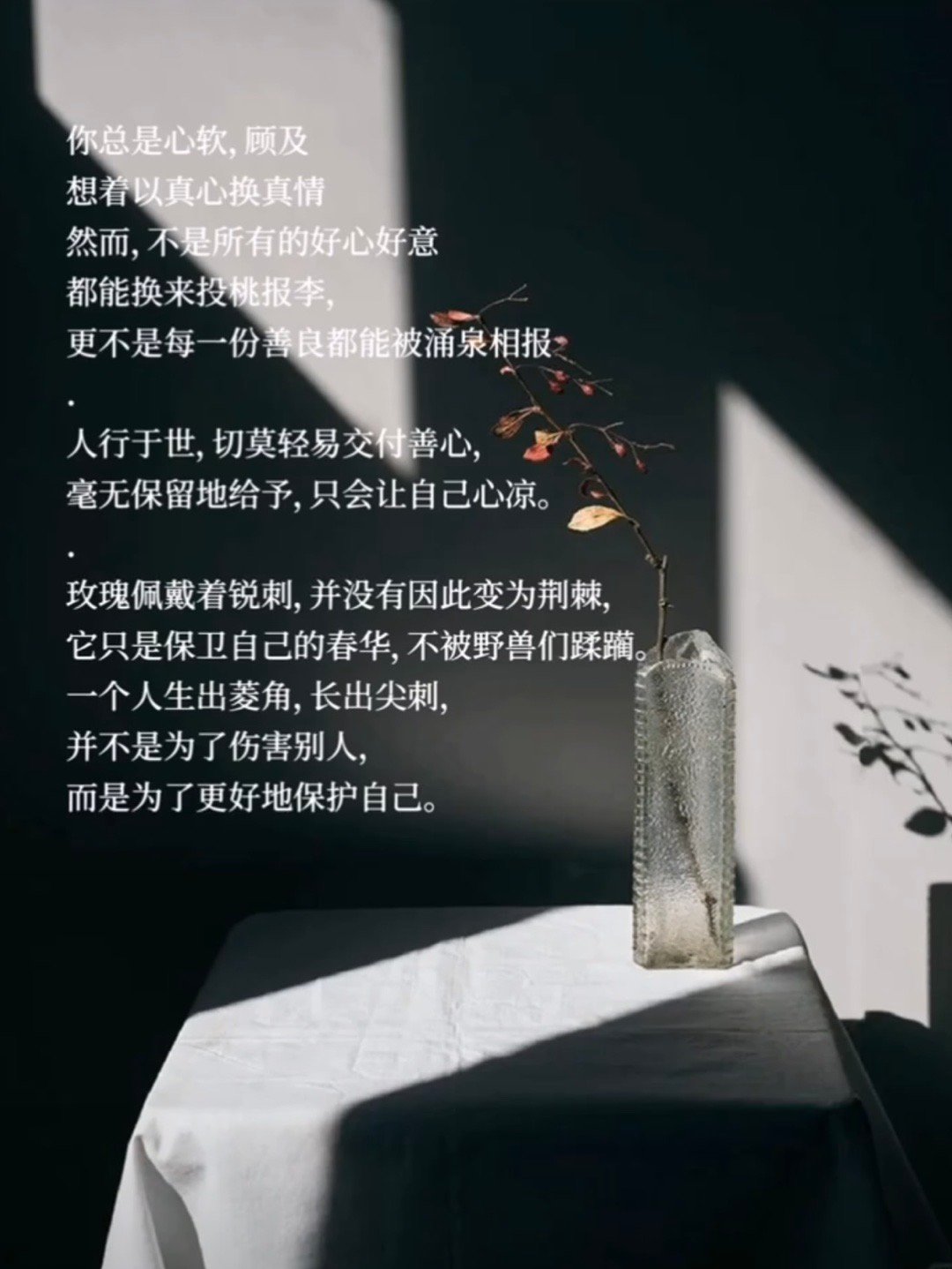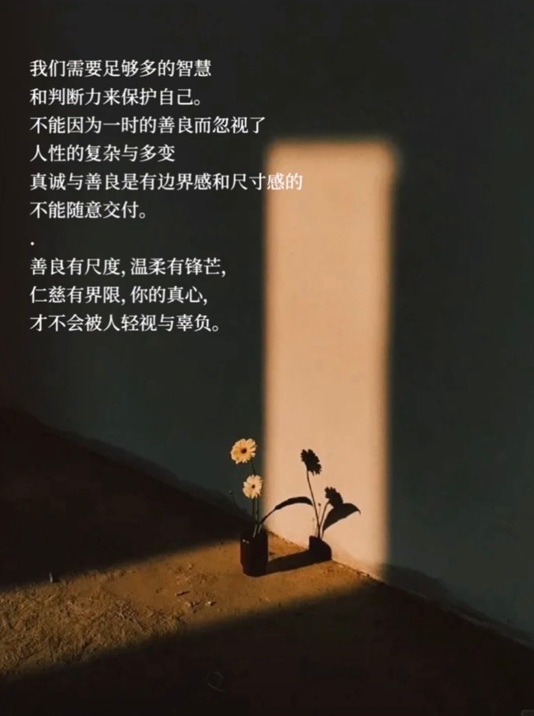 善良是选择,锋芒是智慧,二者兼备方为成熟。带刺的玫瑰最珍贵,有锋芒的善良最有力。善良不失锋芒,温柔而有骨气。善良若无锋芒,如同明珠暗投;锋芒若无善良,则成利刃伤人。在善良的土壤中生长出坚韧的荆棘,既滋养他人又保护自己。愿你,愿我的善良,带点锋芒与有底线!善良是一种选择你的善良必须有点锋芒