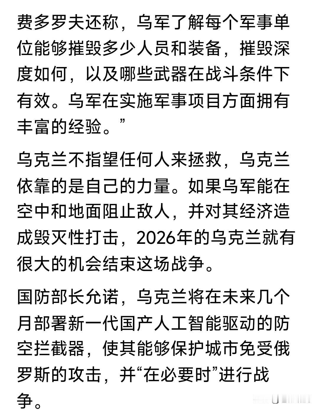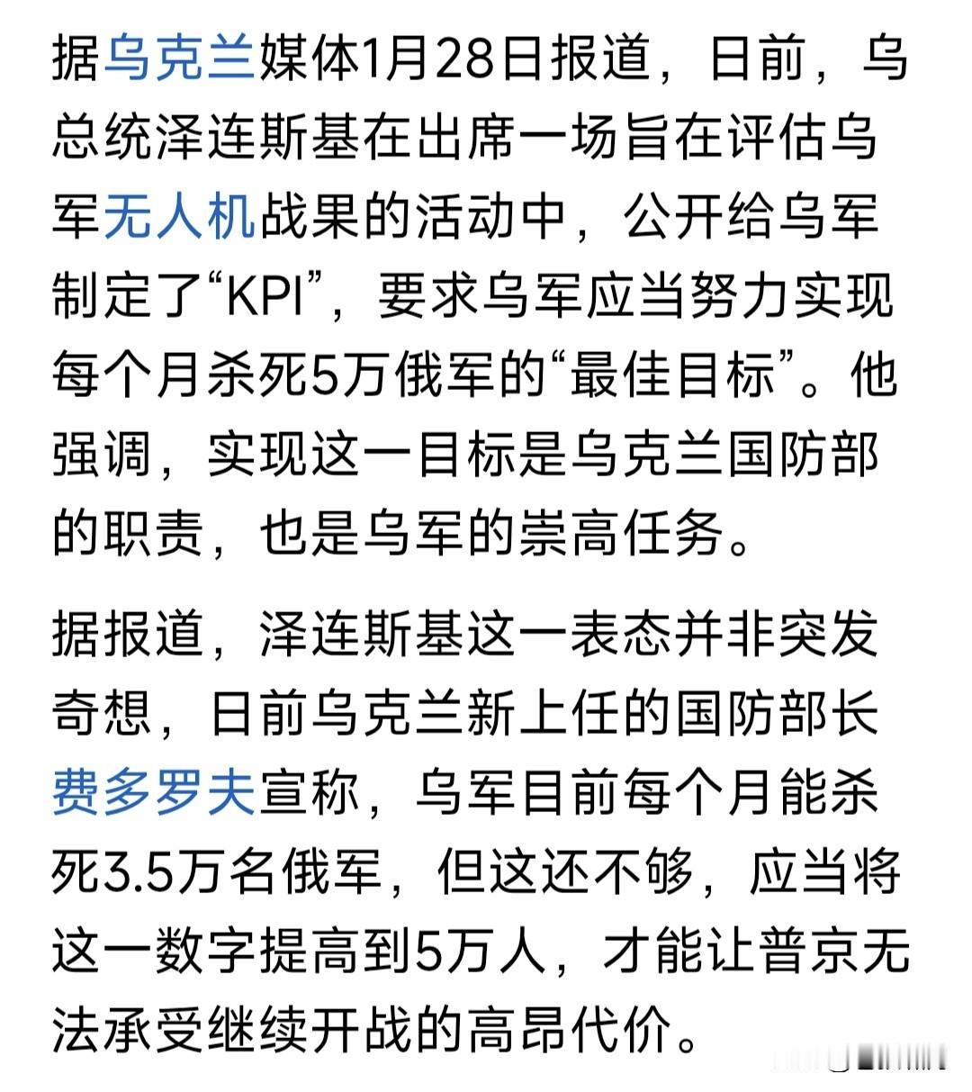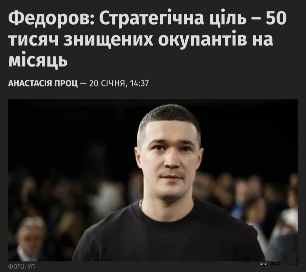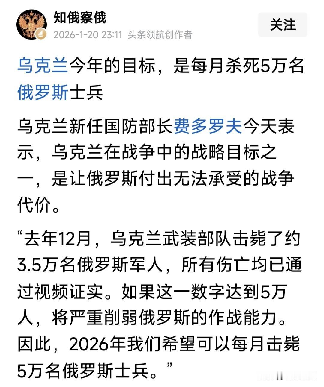 泽连斯基给“愣头青”防长下指令:2026年每月让俄损失5万人!让对方难以承受损失,知难而退结束战争。 这个指令实是力挺!因新任防长费得罗夫,最近声称去年12月,乌军消灭鹅兵3.5万,新一年争取每月5万! 费得罗夫为何敢说这种话?因是武器专家,能让武器发挥最大效能? 小泽为何力挺小费?因俄乌前线僵持,鹅借兵力优势不断向前推进! 乌军正面抗不过,只能积极防御,如果采取措施,大量消耗俄军,让其知难而退,也能扭转局面有效策略。 按照这个数字,每月5万人,一年就是60万呐!此前有报道,说俄乌战争四年,俄已损失120万,加上60万,就是180万!俄还能承受得住吗? 也有网友认为,这场俄乌战争,乌损失比俄要大!西媒宣称俄损失是乌几倍是舆论战。小泽与小费连线,要每月消灭俄军5万,就更是心理战了! 苍狼的观点是:无论战争结局如何?都要基于“联合国宪章”与“国际法”评判是非!反侵略反暴力,尊重各国领土完整与主权,是唯一的评判标准。 同时认为:不管乌方能否实现目标:每月消耗对方5万人,都是一种互相伤害!因为伤敌一千,自损八百啊!即便减半为4~5百,一年数字是多少? 战争是绞肉机,逝去的都是活生生的年轻生命!为保家卫国而死重如泰山,而为其他目标而死呢?价值意义何在?还是及早停战吧!对谁都好啊! …………
