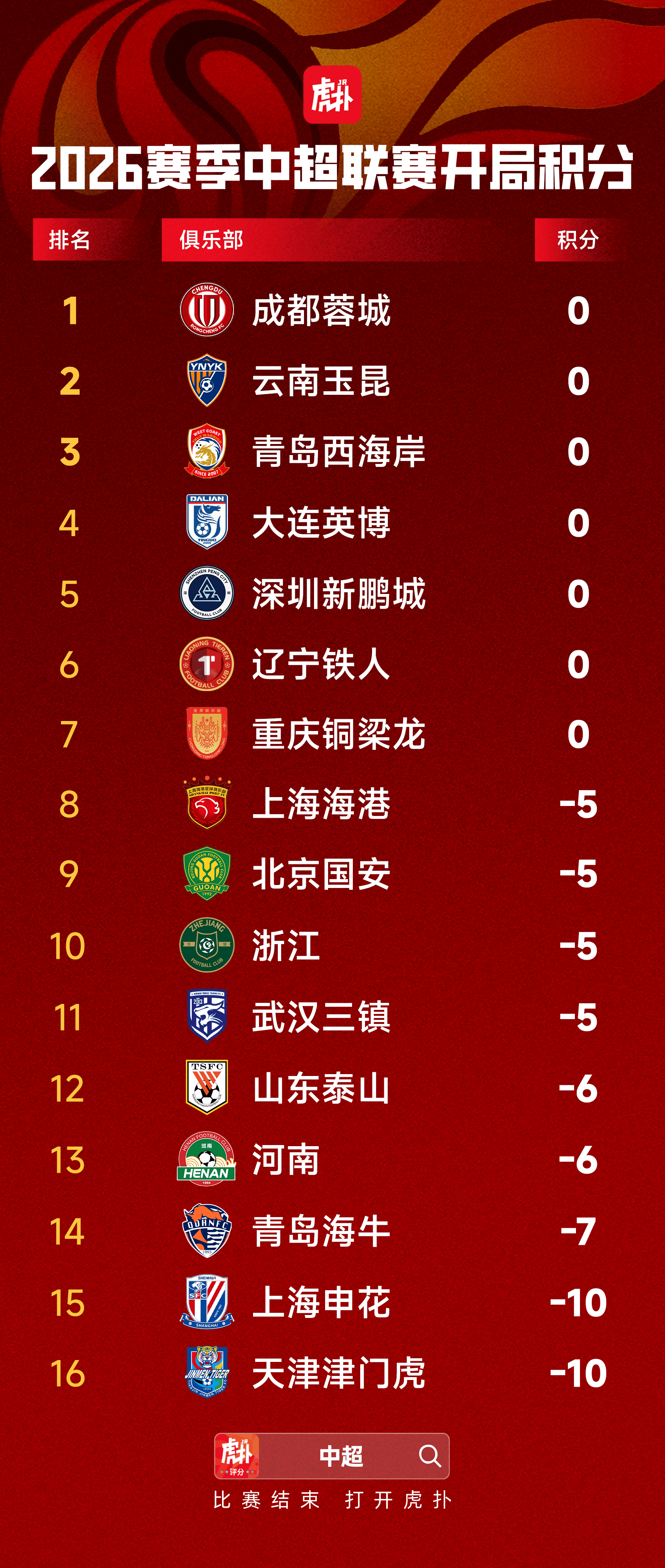 其中,9支参加2026赛季中超联赛的俱乐部遭到了扣分处罚,这也意味着新赛季中超的初始积分发生了重大变化。