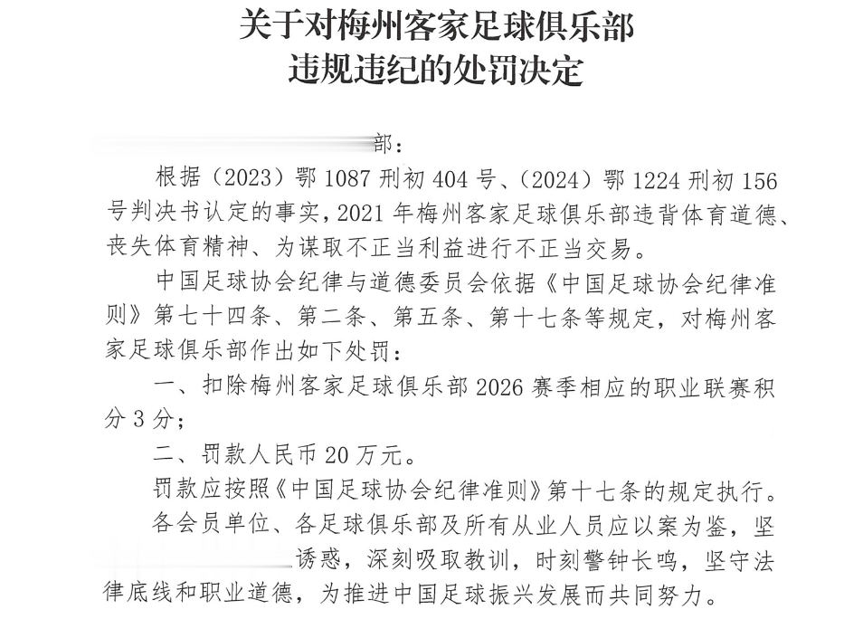 一、扣除梅州客家足球俱乐部2026赛季相应的职业联赛积分3分;