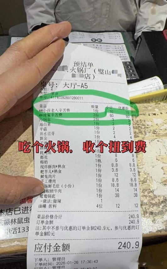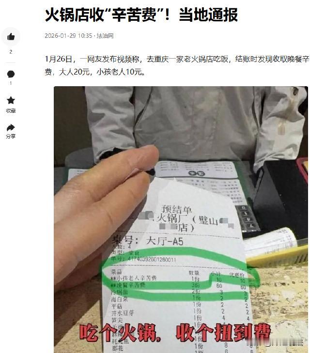 重庆,一女子带3个大人、1个孩子去重庆老火锅吃涮肉,菜品丰富价格实惠,一顿花费240.9元。结账时女子发现账单上有小孩老人辛苦费10元、晚餐辛苦费60元,共70元。女子不解质问,火锅店称辛苦费明码标价,菜品酒水按进价卖,有异议可免单。女子觉得离谱,认为这是变相收取的小费,老板不应让顾客给员工发工资,且结账时才告知不合理,便将此事发到网上。 据法制网、九派快讯2026年1月29日的报道获悉,1月26日下午5点36分,女子带3个大人、1个孩子去重庆老火锅吃涮肉,菜品丰富价格实惠,一顿花费240.9元。结账时女子发现账单上有小孩老人辛苦费10元、晚餐辛苦费60元,共70元。 女子觉得特别纳闷,赶紧叫来服务员,问这辛苦费是怎么回事。 服务员解释说,辛苦费是明码标价的,在店里某个不太显眼的地方有提示,而且菜品酒水都是按进价卖的,利润很低,所以才收辛苦费。 女子觉得这完全就是变相的小费,老板给员工发工资那是老板的事,怎么能让顾客来承担这个费用呢?而且结账的时候才告知有辛苦费,这根本就不合理。 女子要求火锅店给个合理的说法,火锅店却态度强硬,说有异议可以免单,但辛苦费必须得收。 女子觉得自己的权益受到了侵犯,她不想就这么算了,于是把这件事发到了网上。 有的网友看到后觉得火锅店的做法太过分了,这就是在欺负消费者,利用信息不对称来收取额外费用。 也有网友觉得,既然火锅店明码标价了,消费者也有一定的责任,没有提前注意到这个提示。 不过大多数网友还是站在女子这边,认为火锅店这种做法不地道。 火锅店则坚持自己的立场,说辛苦费是为了弥补菜品利润低,给员工多一些补贴,他们觉得这是合理的经营方式,消费者应该理解。 火锅店这种收取辛苦费的行为,到底符不符合法律规定呢? 民法典规定,经营者与消费者进行交易,应当遵循自愿、平等、公平、诚实信用的原则。消费者享有知悉其购买、使用的商品或者接受的服务的真实情况的权利。 火锅店虽然声称辛苦费明码标价,但这个标价的位置可能并不显眼,消费者在消费前很难注意到。 这就侵犯了消费者的知情权,消费者在不知情的情况下被收取了额外费用。 而且,消费者去火锅店消费,支付的是菜品和服务的费用,并没有义务为火锅店给员工发工资而额外付费。 火锅店将本应由自己承担的成本转嫁给消费者,这种做法违背了公平交易的原则。 如果火锅店确实因为菜品利润低,想要给员工补贴,应该通过合理调整菜品价格或者其他合法的方式来解决,而不是以收取辛苦费这种容易引起争议的方式。 消费者权益保护法也明确规定规定,经营者不得以格式条款、通知、声明、店堂告示等方式,作出排除或者限制消费者权利、减轻或者免除经营者责任、加重消费者责任等对消费者不公平、不合理的规定,不得利用格式条款并借助技术手段强制交易。 火锅店收取辛苦费的行为,如果没有在消费者消费前明确告知并取得消费者同意,就属于加重消费者责任的不合理规定,是不符合法律规定的。 一些人为了追求利润,会想出各种名目来收取额外费用,消费者在消费时往往处于弱势地位,容易受到商家的欺诈和误导。 目前,此事并没有明确的结果,但从法律角度分析,火锅店收取辛苦费的行为很可能不被法律认可。 如果女子通过法律途径解决,有很大的可能性会胜诉。 对于此事,你怎么看呢?