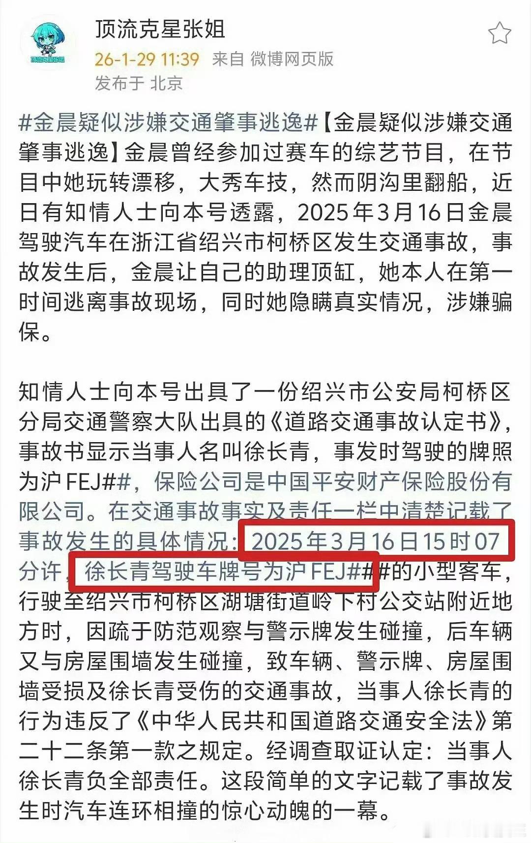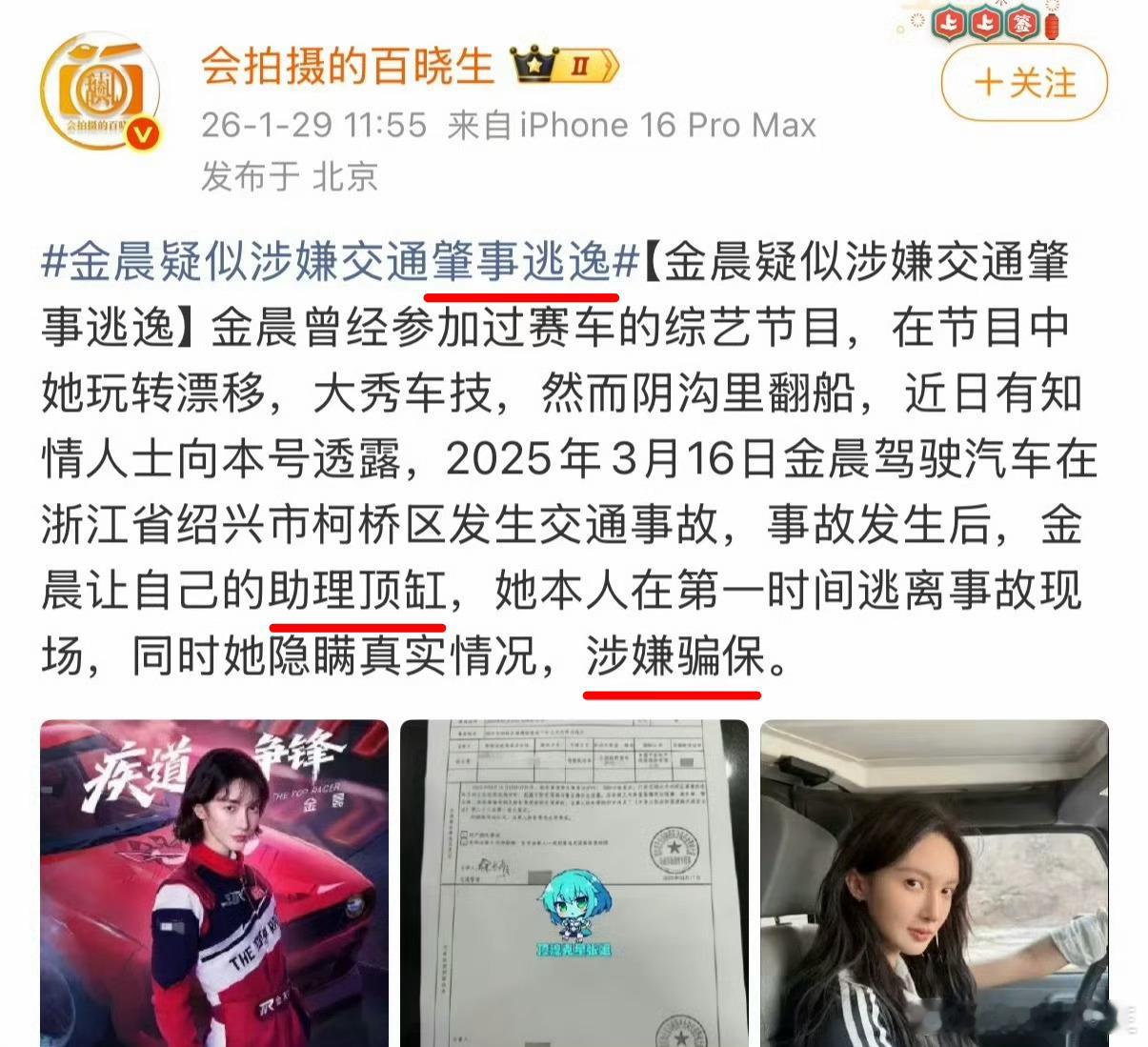曝金晨肇事逃逸…要是真的…啥脑子啊,还去报保险,人家保险都得调监控的,现在监控