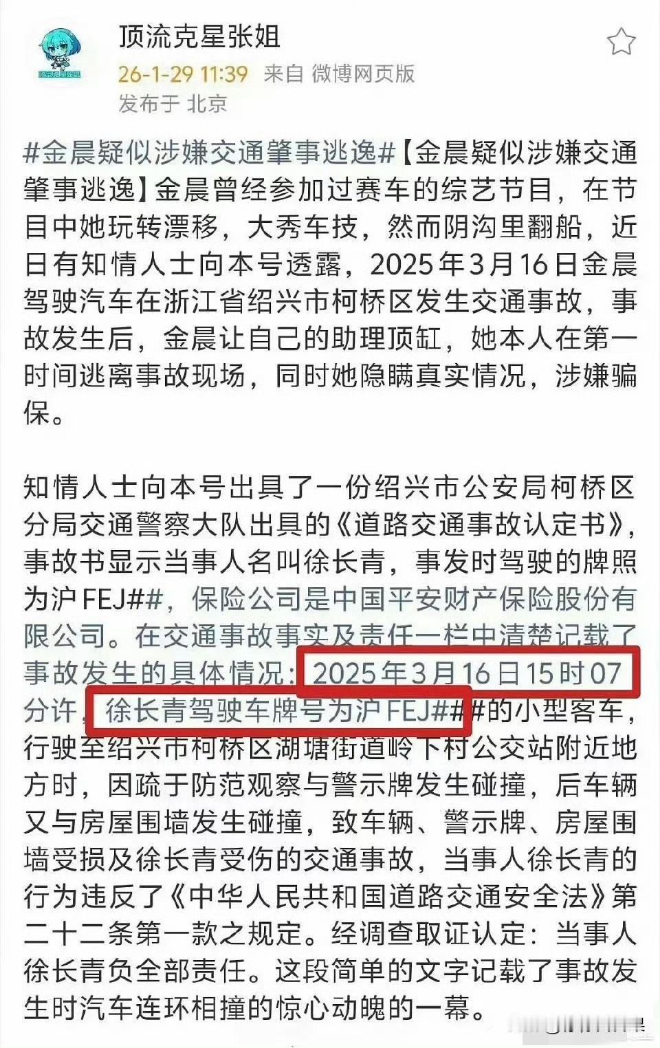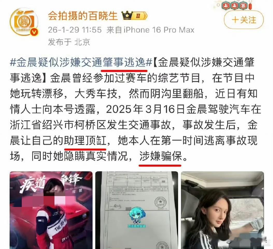 金晨被曝“顶包逃逸+疑似骗保”,瓜比剧还刺激! 家人们,这瓜我必须连夜给你们扒出来!🍉 前阵子金晨刚靠新剧美上热搜,结果今天直接被爆了个大的——去年3月在绍兴出了车祸,自己跑了,让助理顶包,还被保险公司怀疑骗保! 这剧情比她演的剧还抓马: 事故现场:车撞了围墙和警示牌,助理还受了轻伤。 迷惑操作:金晨和经纪人直接溜了,留下助理跟交警说“我开的车”。 翻车原因:保险公司查监控发现不对,直接报警了! 更绝的是,后来金晨团队想私下解决,主动提出自己承担所有损失,想让保险公司撤案。虽然保险公司撤了,但交警那边还在核实,这事儿根本没翻篇。 网友们都炸了: - “这要是真的,顶包+逃逸+骗保,比塌房还严重吧?” - “怪不得之前一直捂着,现在是纸包不住火了?” - “等一个官方通报,到底是误会还是实锤?” 咱就是说,明星的“塌房”姿势越来越五花八门了。这瓜到底是“剧本杀”还是“实锤局”?只能坐等交警的调查结果了。 金晨 顶包逃逸 明星八卦