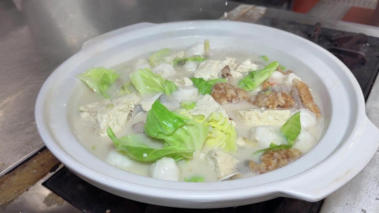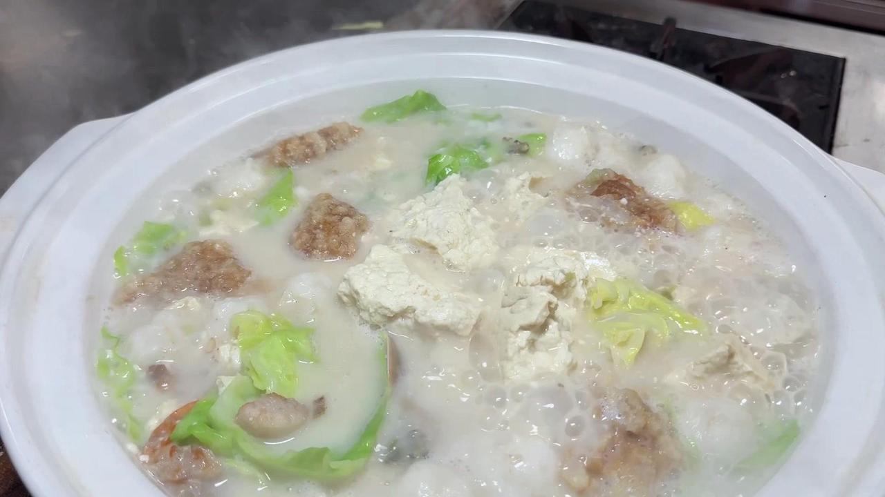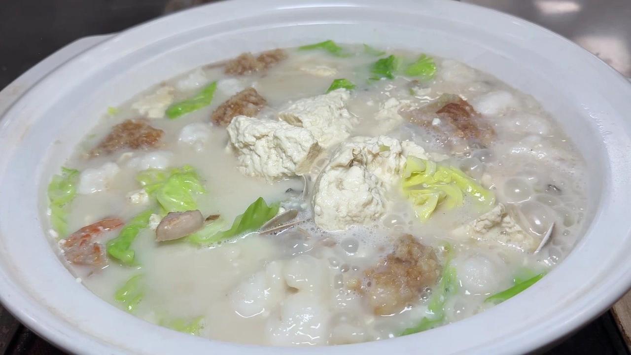 闽南人年夜饭怎么能少了豆腐?这款豆腐料理我愿称之为“饭渣杀手”! 先准备好食材:空豆腐切块,三层肉煸干,下葱白姜片爆香。接着加入骨汤,放入小海蚌、虾干、墨鱼丸,加味精、鸡粉、盐、鸡汁调味,再倒少许海蚌汤,炖至汤汁奶白。 最后放入油渣、海蛎和包菜,煮到食材熟透就可以出锅啦!嫩滑的豆腐吸饱了海鲜的鲜味,一口下去满嘴都是幸福感~