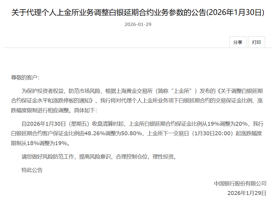 1月29日,中国银行在其官网发布公告,为保护投资者权益,防范市场风险,根据上海黄金交易所(简称“上金所”)发布的《关于调整白银延期合约保证金水平和涨跌停板的通知》,中国银行将对代理个人上金所业务项下白银延期合约的交易保证金比例、涨跌幅度限制进行相应调整。