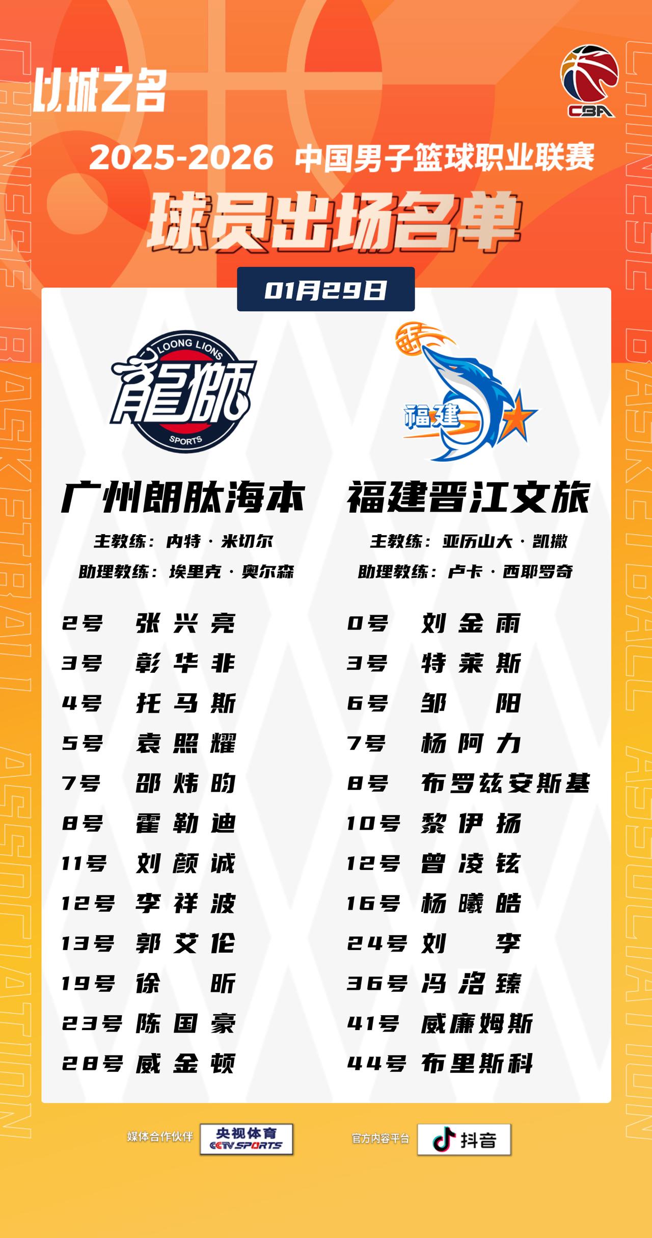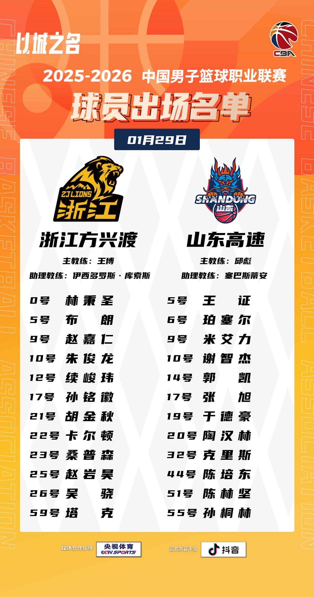 【大名单出炉】2025-2026赛季CBA联赛常规赛第二十一轮今晚继续进行,5场