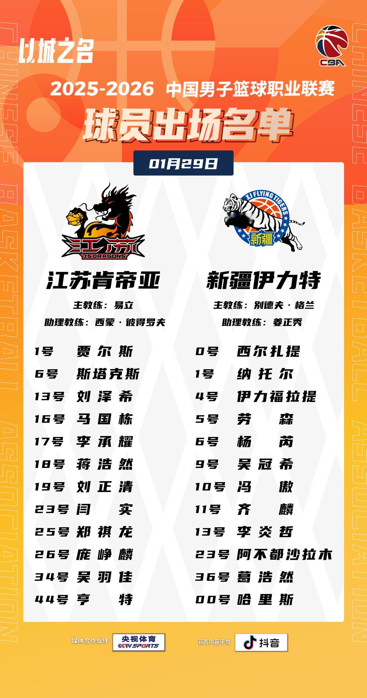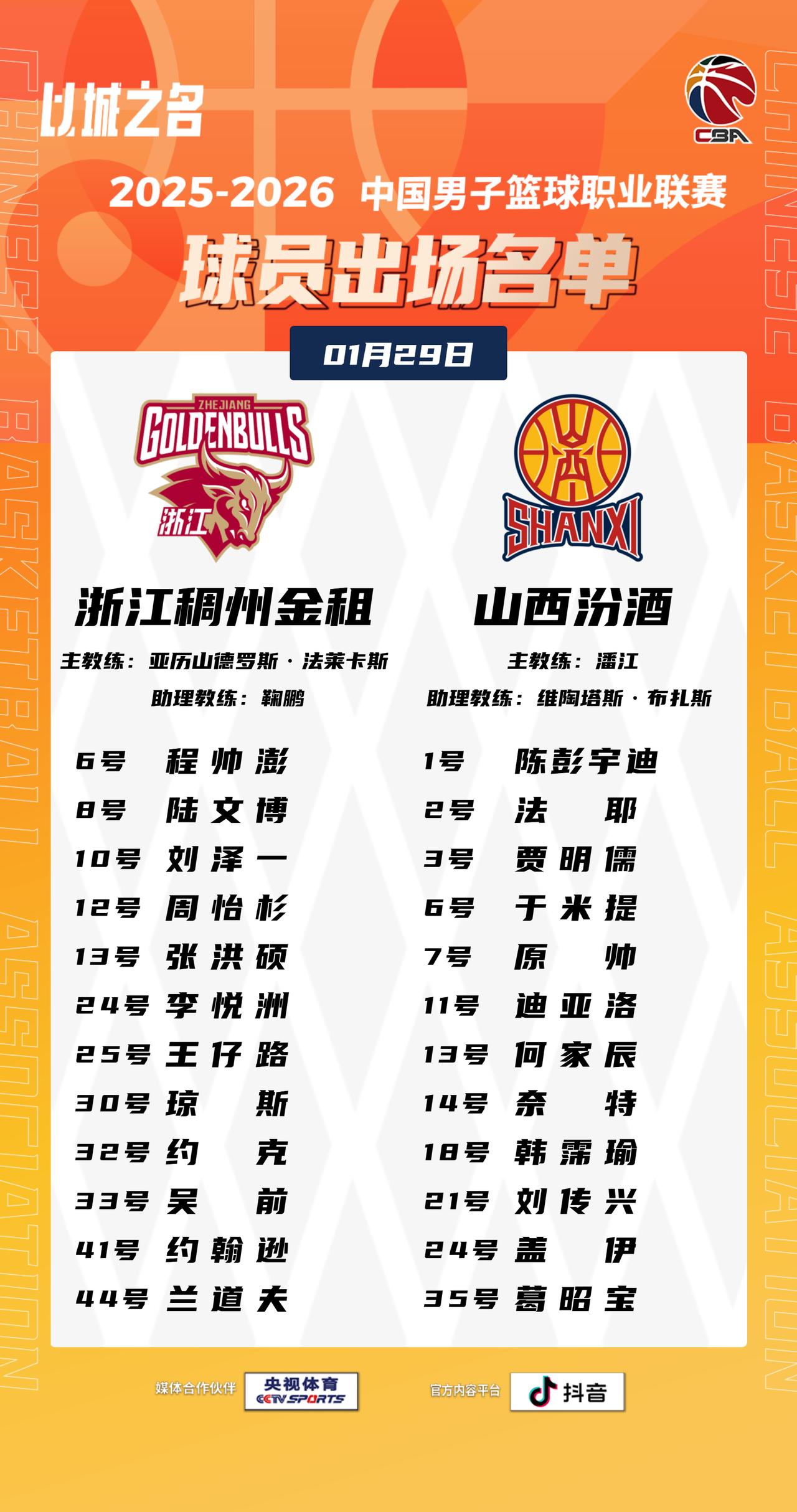 【大名单出炉】2025-2026赛季CBA联赛常规赛第二十一轮今晚继续进行,5场比赛将在19:35同时跳球,敬请期待!