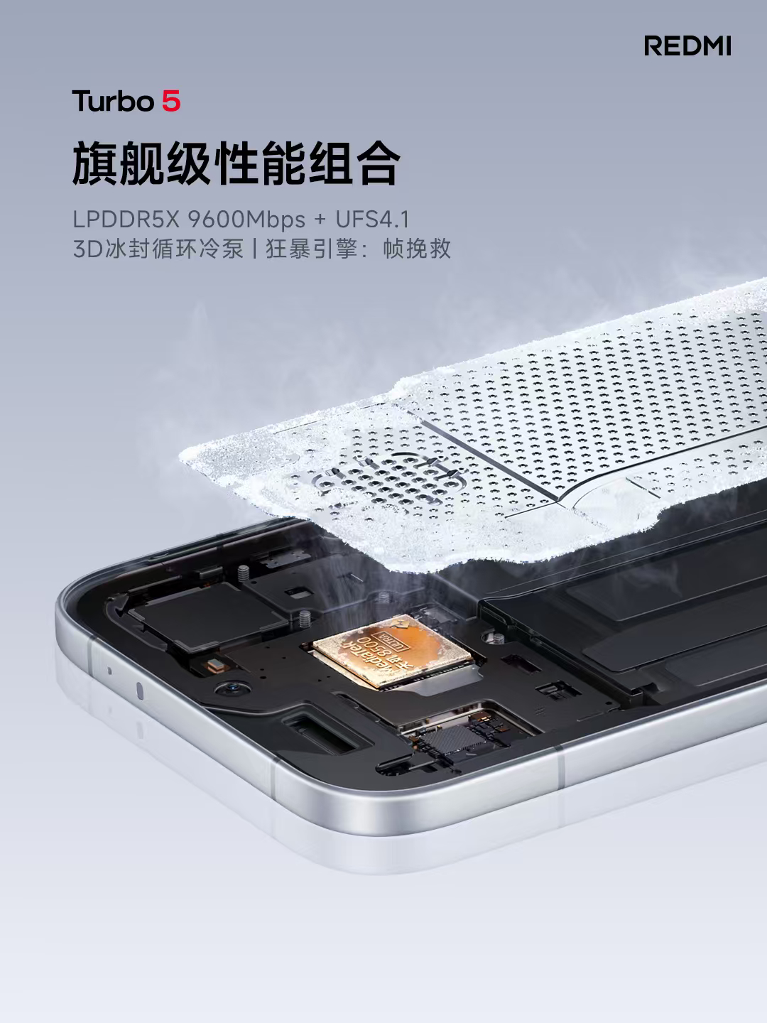 Turbo5 性能首批搭载天玑8500-Ultra 高性能低功耗平台搭载旗舰级 3D 冰封循环冷泵,高速存储组合最新狂暴引擎,CPU/GPU/DDR 一体化调频