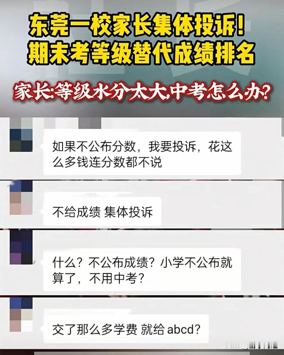 今日,东莞市某民办初中因未公开期末考试成绩,导致家长群体产生忧虑情绪。 该校初一年级发布通告,明确表示期末成绩将以ABCD等级形式呈现,此举引发了部分家长的不满要投诉。 与此同时,数日前东莞虎门某小学六年级教师因将分数直接标注于试卷上,同样遭到家长投诉,相关部门回应称未来将采用等级评分制。 此前有家长因公开成绩而投诉,如今又有家长因未公开成绩要投诉,双方各有其合理诉求,这有点让东莞市教育局陷入两难境地了。