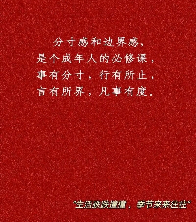 著名学者梁实秋曾说: “与朋友交,久而敬之,敬也就是保持距离,也就是防止过分亲昵。友谊不可透支,总要保留几分。”男女授受不亲,自己有边界,别人才不会越界;自己懂边界,别人才会更尊重。行有所止,言有所界,凡事有度。人与人之间交往,关系再好,“亲密要有间。”人与人之间关系再好,也离不开“分寸”二字。分寸不是陌生,界限不是路人,尊重不是玩笑。再好的关系,没有边界感,也会成为一场灾难。而最终买单的,往往是自己。两性亲密关系分寸感