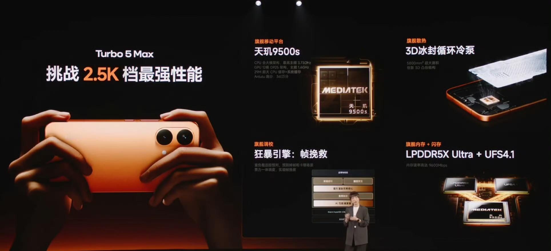REDMI Turbo 5 Max汇总:天玑9500s+LPDDR5X Ultra+UFS4.1性能铁三角,金属中框、超声波指纹、对称双1115F扬声器+满级防水,此外还拥有双频GPS+四频北斗以及T1S信号增强芯片,续航方面9000mAh小米最大金沙江电池,100W PPS+27W有线反充,配置卷到没边!红米Turbo5发布会