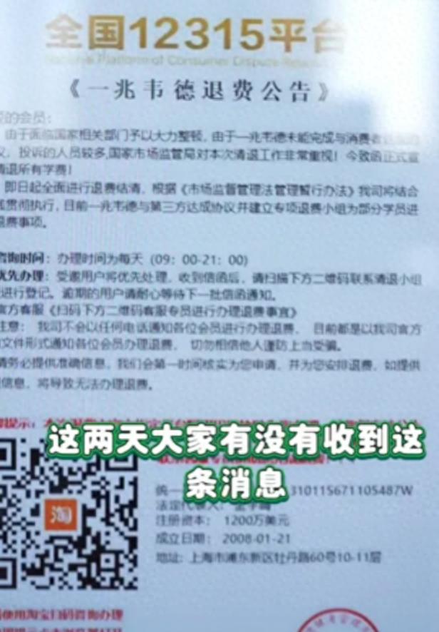 A市民收到顶端标有“全国12315平台”醒目字样的短信图片,标题为《一兆韦德退费公告》,声称清退学费。该市民联系“客服专员”后,被以“购买理财产品退费”“充值返利”“做任务”等名义骗走1.5万余元。