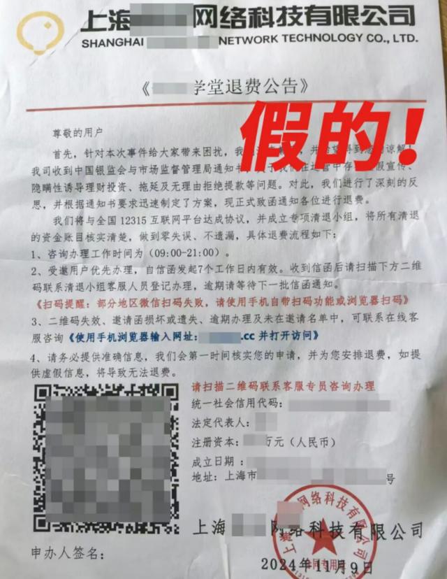 B市民收到快递包裹中夹带的《某某学堂退费公告》称,某网络科技公司因虚假宣传等问题被市场监管局通知,经深刻反思后决定退费,并与全国12315平台达成协议,成立专项清退小组。该市民添加“退款客服”后,被告知只能以“购买基金增值”的方式退款,于是分多笔充值1.5万余元,准备提现时发现被骗。
