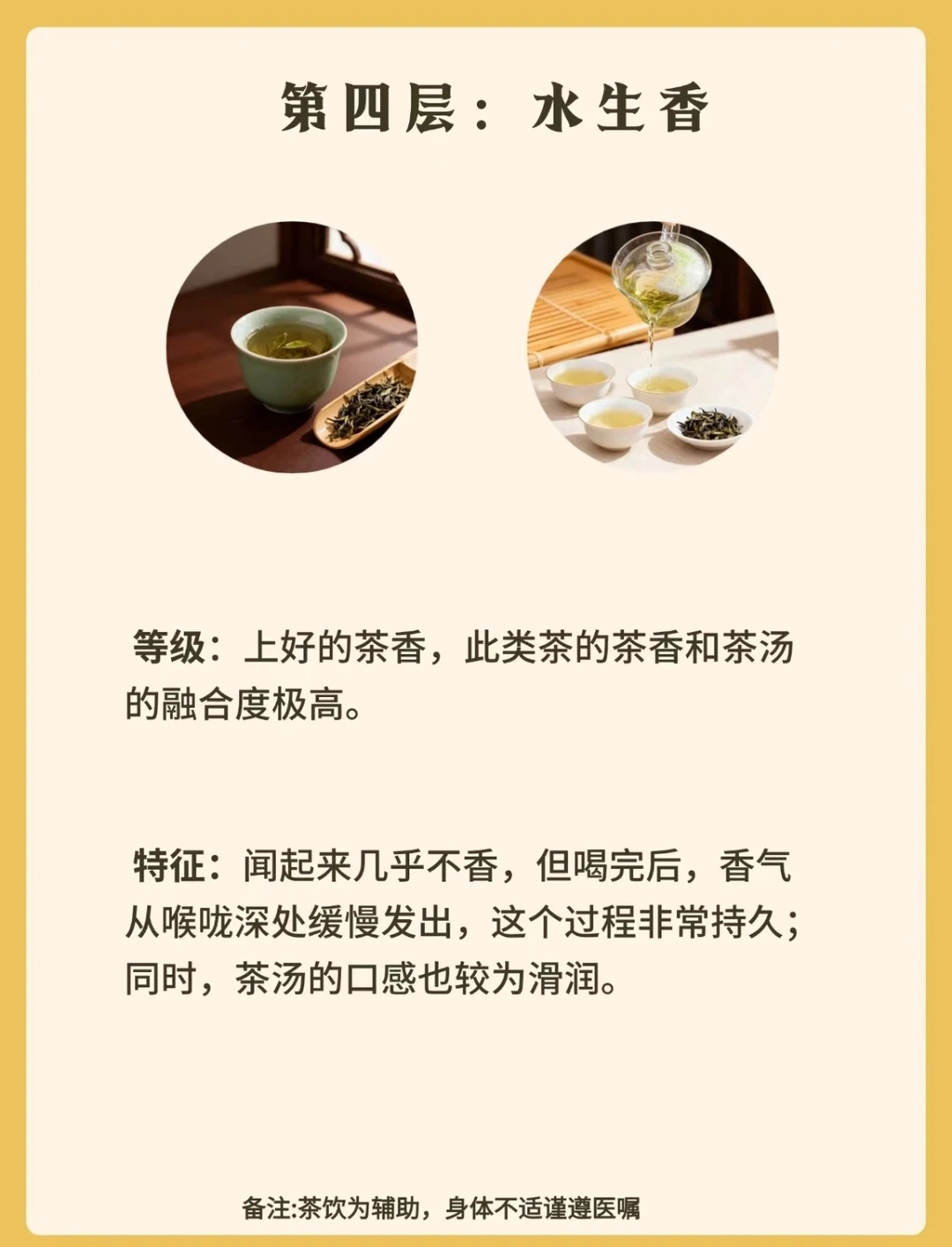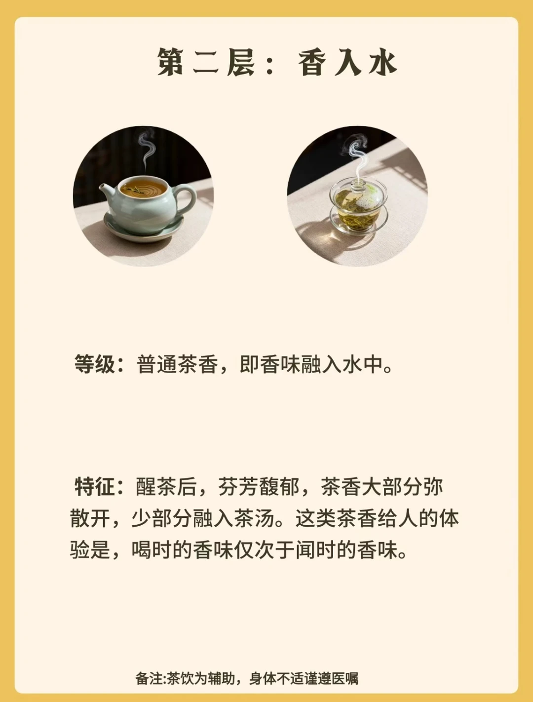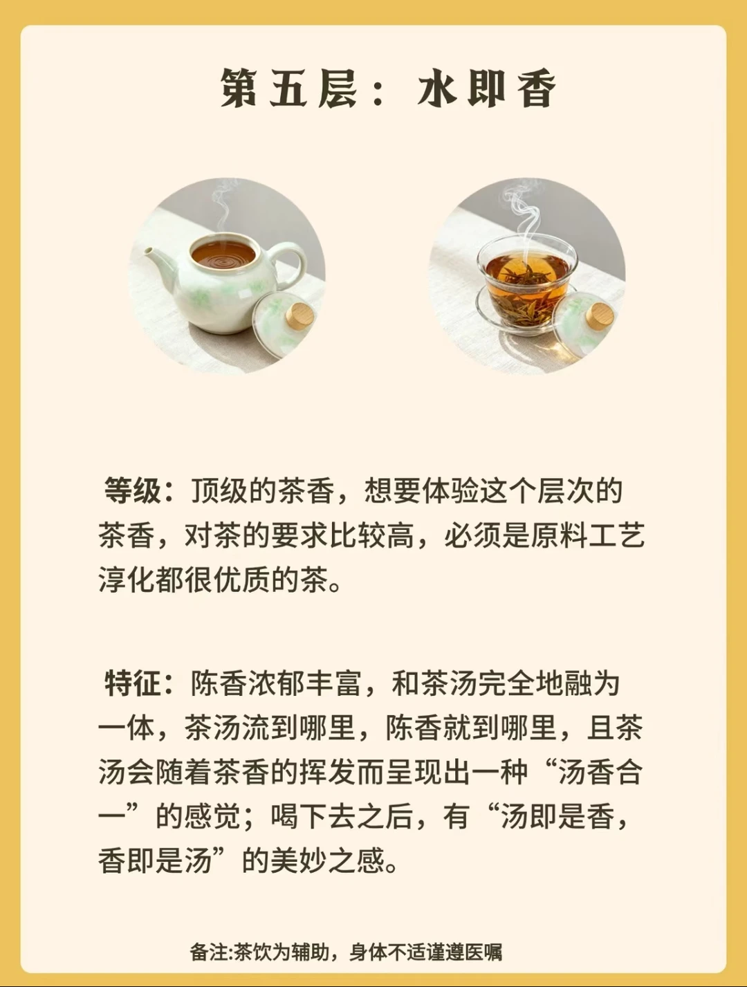 香气不再漂浮,而是部分融入水中,入口时香与水初步结合。茶汤入口,香气随水流弥漫口腔,虽未完全交融,却已能感受到香与水的呼应,口感比第一层更显温润。