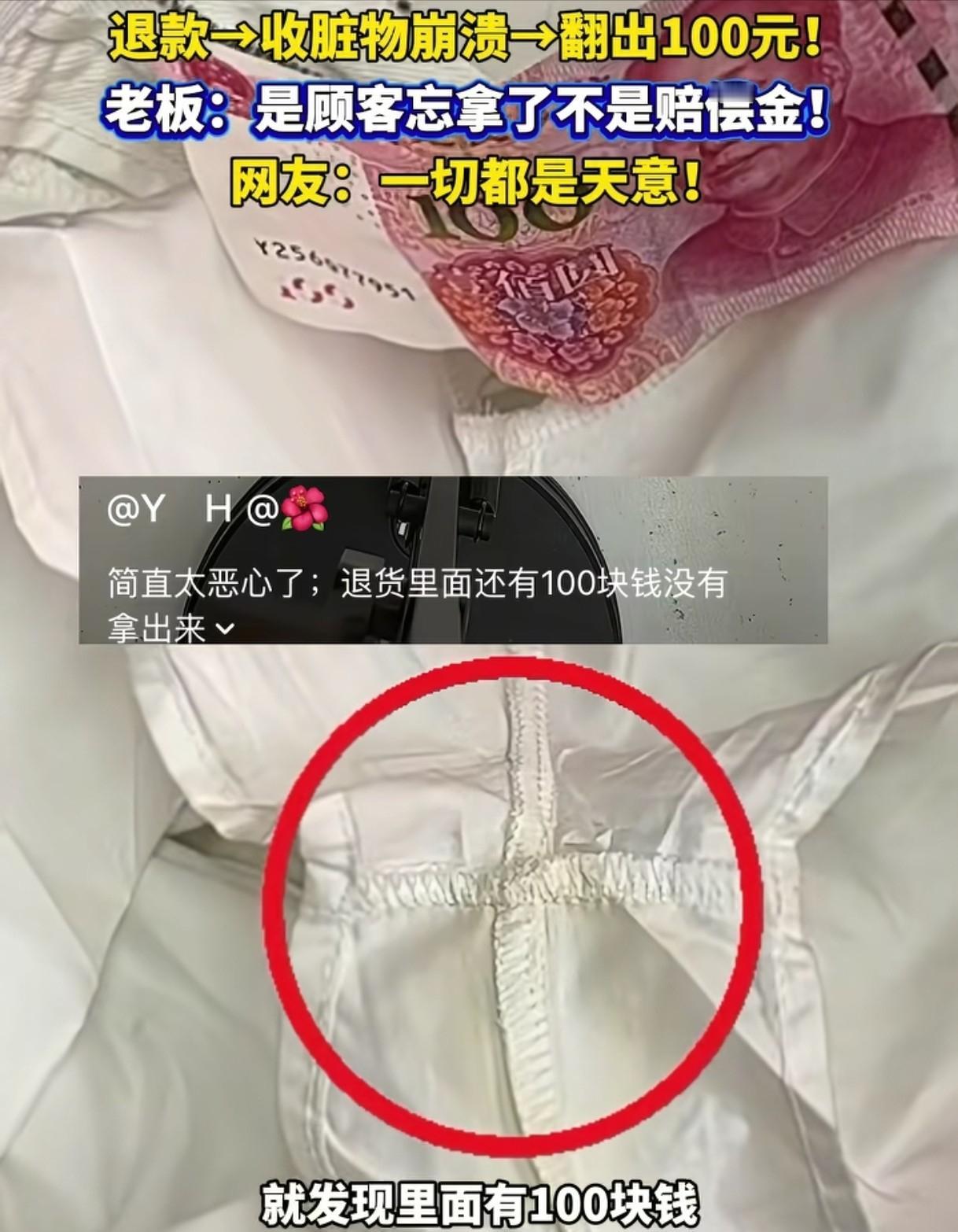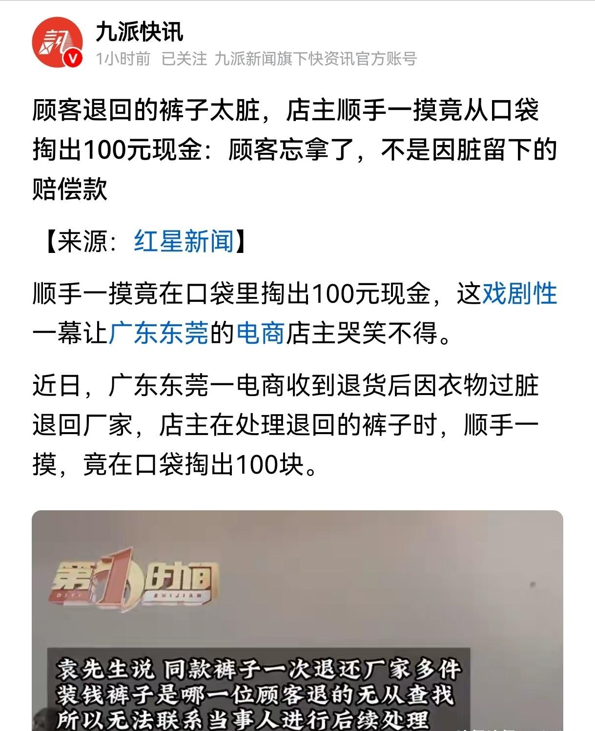 “这就是天意!”广东东莞,店主收到顾客退回来的裤子,看到吊牌完整,也没仔细检查,就把70多块钱的货款退给了对方。可没想到,他把裤子返给工厂后,工厂又把裤子退回来了,店主这才发现裤子明显被人穿过了,裤裆都是黄的,可他一摸口袋,却从里面掏出了100块钱。店主有些哭笑不得:这100元应该是顾客忘拿了,不是因脏留下的赔偿款。 广东东莞那间网店仓库里,货架上堆着一袋袋退回来的包裹,地上还有没来得及收拾的纸箱和胶带。 袁先生把一条白色短裤摊在桌面上,脸色很难看:裤裆的位置已经发黄,明显不是试穿两分钟,能弄成的样子。 按他平时的进货价,这条裤子差不多七十块左右,再算上来回运费、人工处理的时间,基本等于这单白干还倒贴。 他正准备把这条裤子当瑕疵品处理,顺手摸了一下口袋,结果指尖碰到一张折得很平的纸,掏出来一看,是一张红色的一百元现金。 钱挺新,硬挺挺的那种,不像是放了很久,袁先生愣了几秒,反复看了看裤子,又看了看钱,第一反应不是“赚到了”,而是更憋屈:这条裤子都脏成这样了,退回来的人居然还能把一百块忘在里面。 事情的来龙去脉其实很常见,前几天有人下单,收到后没几天就申请“七天无理由”,理由写得也很模糊。 袁先生店里走量,退货每天都有不少,为了不把客服和售后拖死,他通常只看两个点:吊牌在不在、外观有没有明显破损。 只要看着“差不多”,就先给通过退款,免得顾客去平台投诉影响评分,很多做网店的都明白,这种时候较真,最后往往是自己更费劲。 他本来以为这单就这么过去了,最多心里不舒服一下,直到他把这批退货打包寄回上游工厂,工厂那边直接拒收退回,备注写得很明白:污渍明显,影响二次销售。 货又回到他手里,他只能重新拆包核对,不然就得自己全部吃下,也正是这次不得不重新检查,他才会把手伸进口袋里。 要不是工厂卡得严,这张钱很可能就跟着裤子,一起被他丢进瑕疵品袋里,或者在整理时,被当垃圾一块儿处理掉,连发现的机会都没有。 袁先生坐下来算了一下,越算越觉得讽刺:裤子成本、运费、打包耗材、来回折腾的人工时间,加起来差不多就到一百块上下。 那张钞票放在桌上,像是把他的损失“补”回来了,但又补得很别扭——这钱大概率不是对方故意留的,更像是随手塞在口袋里,退货时忘记掏出来的零用钱。 从结果看,想占便宜的人反倒吃了亏,对方可能想着穿几天再退,省下几十块钱,最后却因为一个疏忽,把一百块搭进去,等于自己为这次折腾付了代价。 但真要说怎么处理,也不是一句“活该”就能结束,按法律上的说法,捡到别人遗失的钱,是要尽量归还的,商家也没有因为对方退货不当,就天然获得这笔现金的所有权。 问题是现实操作里根本对不上人:退货量大、同款同色同尺码的包裹一批批进出,后台订单也不可能精确到“哪一条裤子口袋里有现金”这种程度。 更何况,退货回来后往往还会被重新装袋、重新贴标,线索很容易断。 所以袁先生的纠结很真实:他不觉得这是自己“赚的”,但也很难找到失主去退。 最后大家在网上看到这个事,会觉得像是一种很土很直接的“对冲”——你想钻规则的空子,结果被自己的疏忽,把成本补回去了。 这件事说到底还是提醒两边:买家别把退货当成免费试用,商家也别为了省事完全不检查,很多时候,一点小心思带来的麻烦,比一条裤子值钱得多。