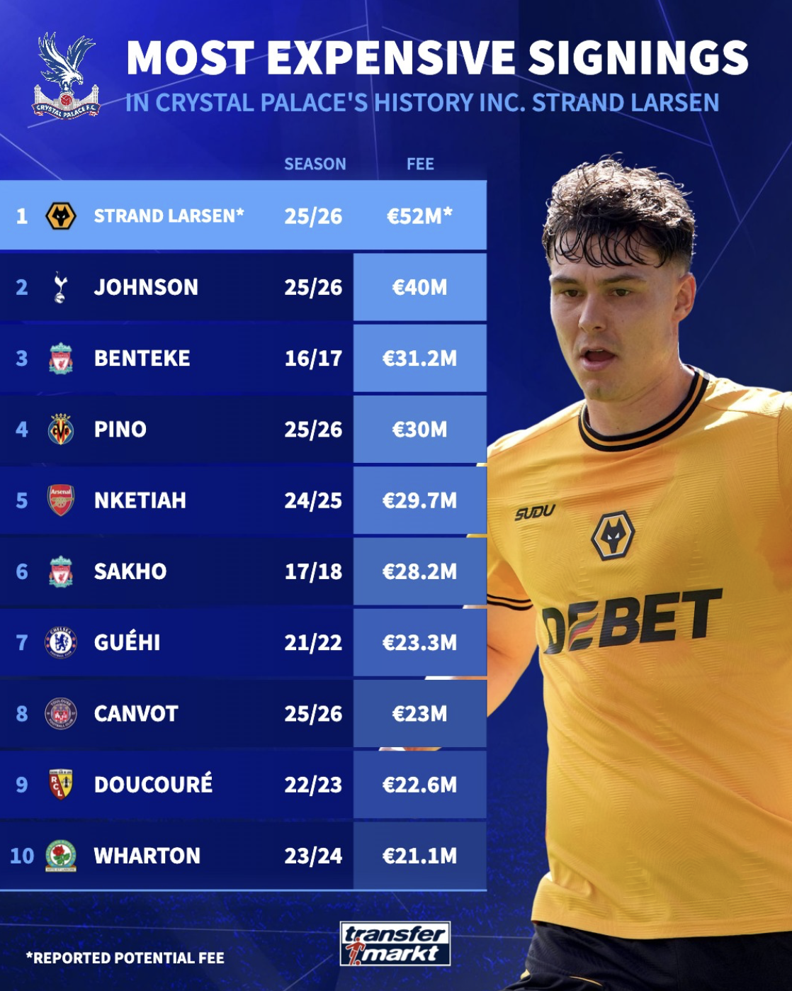 虎扑01月29日讯德转统计了水晶宫转入球员转会费排行榜。