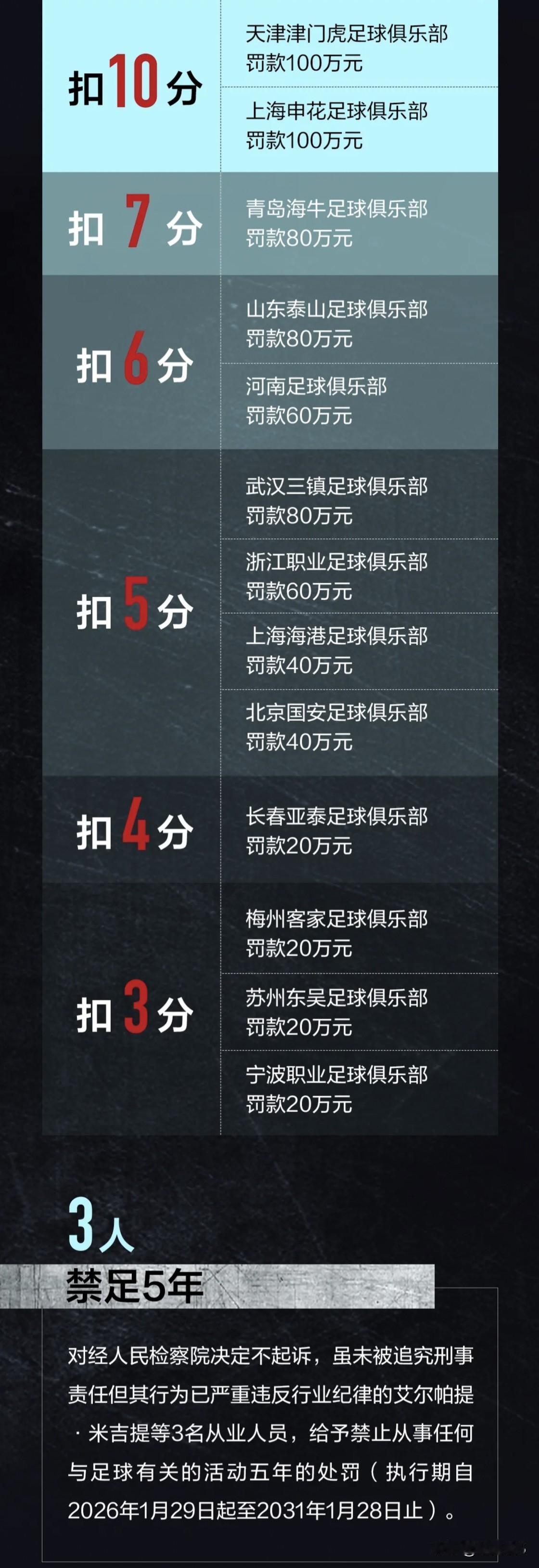13家足球俱乐部到底参与了哪些“假赌黑的事件? 昨天,中国足协通报了“假赌黑”的处罚决定。其中对13家足球俱乐部进行了扣分、罚款,对73人进行了终身禁足及3人禁足5年的处罚。 最让人关心的是:2026年被处罚的几支中超的球队。 1.天津津门虎、上海申花均被扣除10分、罚款100万元。 2.青岛海牛被扣除7分,罚款80万元。 3.山东泰山被扣除6分,罚款80万元。4.河南队被扣除6分,罚款60万元。 5.武汉三镇、浙江队、上海海港、北京国安均被扣除5分,罚款分别为80万元、60万元、40万元和40万元。 6.长春亚泰扣除4分,罚款20万元。 7.梅州客家、苏州东吴、宁波均被扣除3分,罚款20万元。 不懂就问,既然是对“假赌黑”球队的处罚,那么这13家足球俱乐部,到底是参与了哪些假、赌、黑的事件?