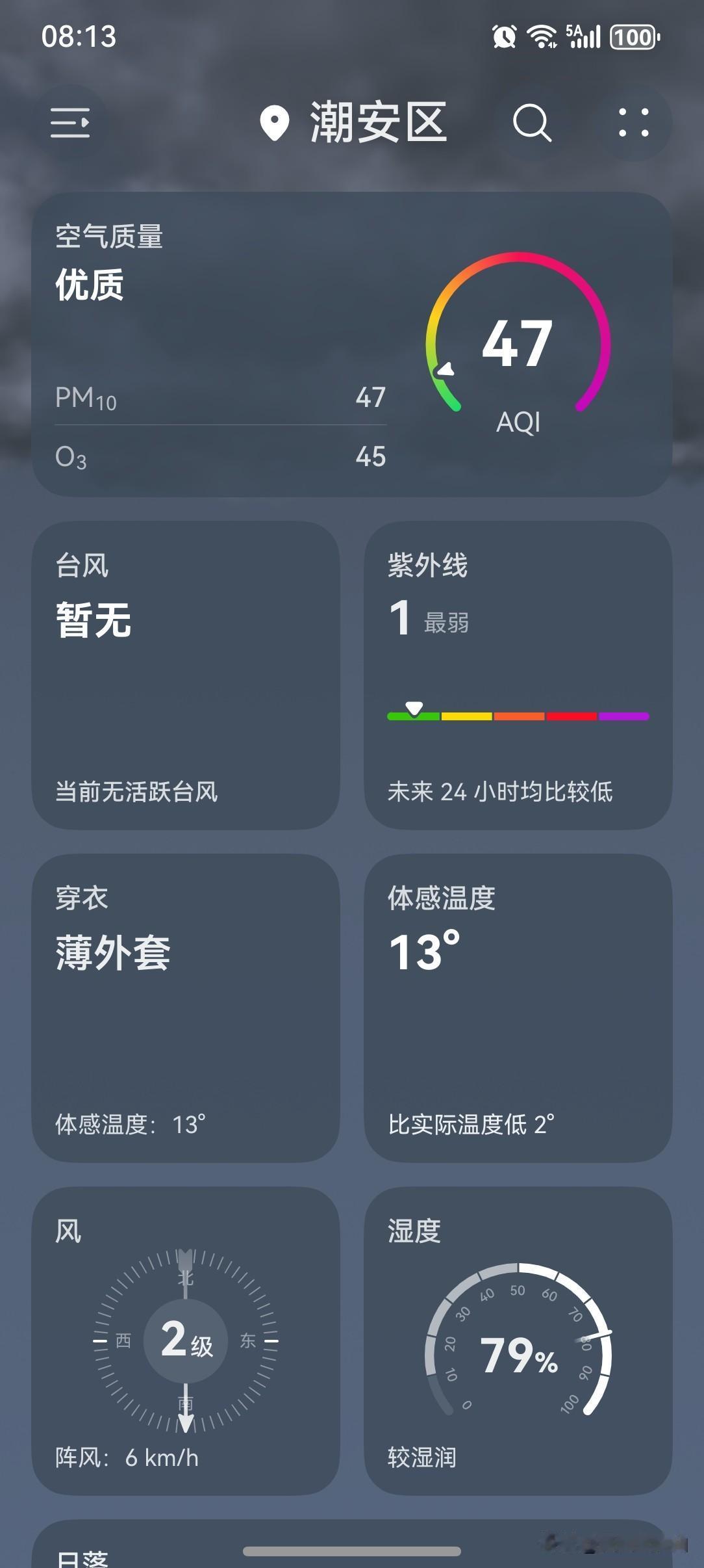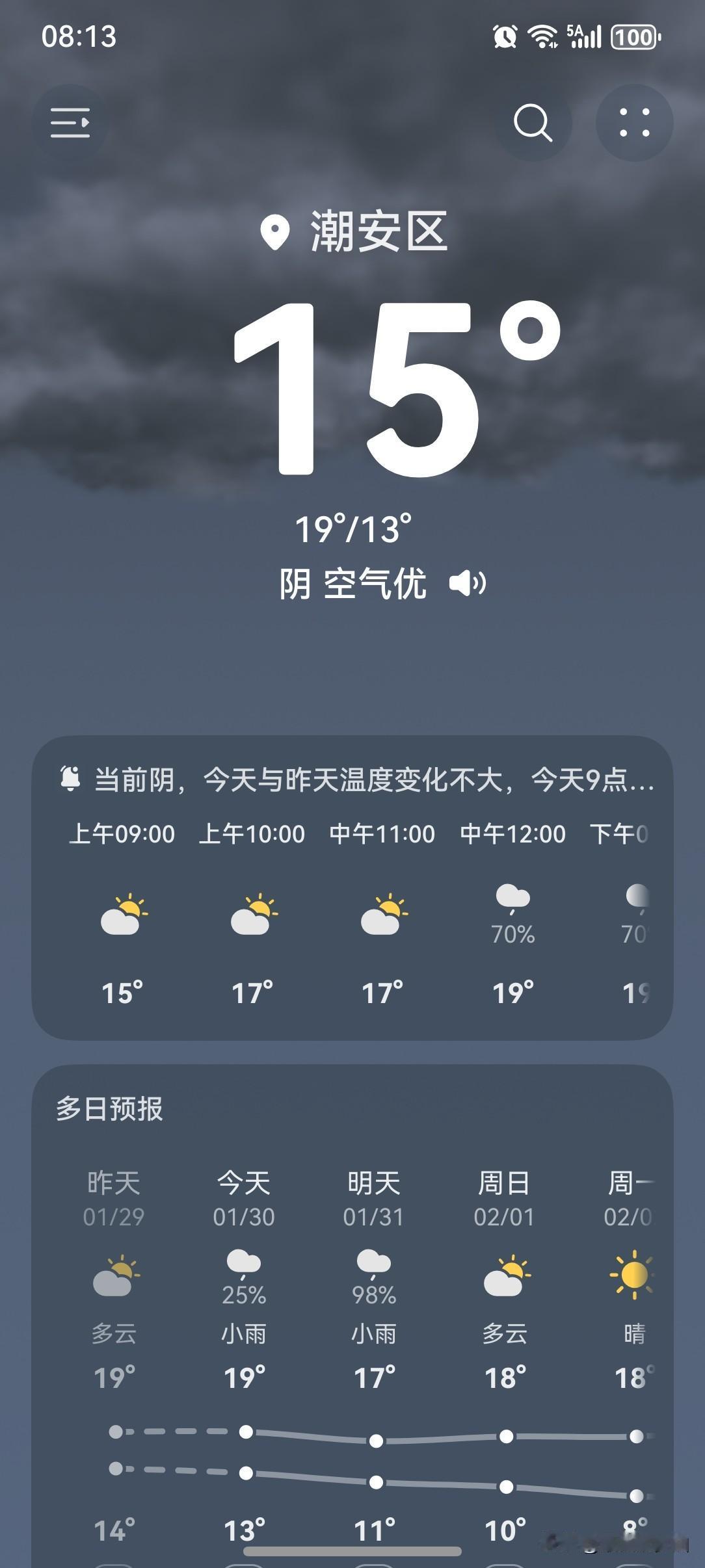 新一轮冷空气影响几何?广东1月最后一天冷空气冲业绩! 今天(30日),广东大部云量逐渐增多,早晚有轻雾或雾,部分市县有分散性的弱降水;31日~2月2日,新一股中等强度冷空气影响我省,粤北、粤东市县有小雨局部中雨,大部分市县气温下降3~6℃。 今天(30日),潮州阴天有小雨,气温13~19℃,此刻气温15℃,体感温度13℃。 今天的气温跟昨天差不多,一样都是非常暖和!不过,今天阴天有小雨,此刻天气阴沉,多了一些阴郁的感觉!没有阳光的日子啊!心情果然轻快不起来了。 一起来看看今天的天空吧!云量大增,比昨天多了许多。厚重的云层把太阳遮得严丝合缝,一缕阳光都透不过来!由此可见今天的云量是得有多厚啊! 冷空气将在1月的最后一天抵达广东,强度也不容小觑,中等强度冷空气所带来的降温效果应该会很明显。并且,冷空气不是单打独斗,而是带着雨水而来的。冷空气+雨水!降温效果简直不要太酸爽啦! 温暖的时光所剩不多啦!明天冷空气携带雨水一起驾到,湿冷模式即将开启…… 小伙伴们!防寒保暖措施提前准备起来吧! [捂脸][笑哭][大笑][我想静静][捂脸][大笑][大笑][我想静静][捂脸