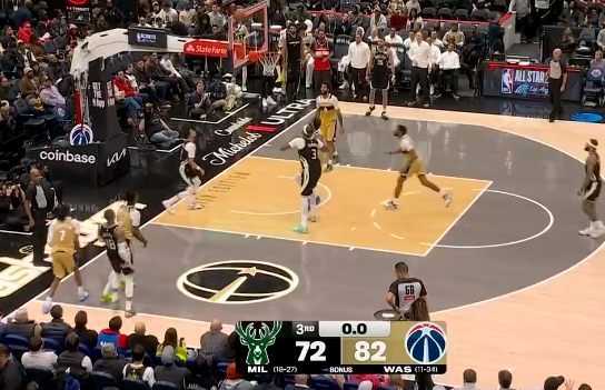 比赛的第三节,库兹马后仰中投不中,雄鹿落后奇才10分进入第四节。