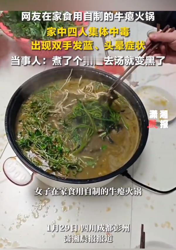 女子吃自制牛瘪火锅之后双手变成蓝色的了 成都这位大姐真是啥都敢尝啊!在家自制牛瘪火锅,煮的时候加了种不知名的菜,汤底直接变黑了,愣是还敢吃,最后一家子4口全出现了不良反应,个个双手发蓝、头晕恶心,现在还在医院遭罪,大姐输液刚好转,家人还上吐下泻的。 咱就说,汤都黑成那样了,但凡有点常识都知道不对劲吧?一个人不舒服可能有别的原因,四口人全中招,这食材问题明摆着的啊! 都21世纪了,吃的方面还是得讲究点科学和安全,可别再凭着一股子猎奇心瞎折腾,吃出问题来遭罪的还是自己和家人。做个好堂堂正正的21世纪现代文明人,好吧,不要再做原始人了。