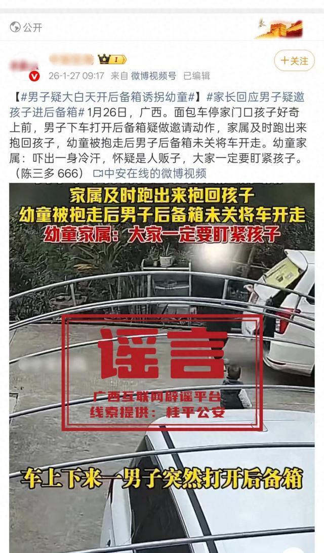 近日,网络上流传“桂平一男子疑打开汽车后备箱诱拐儿童”的信息,引发关注。