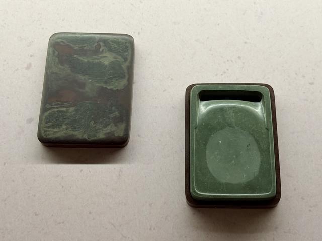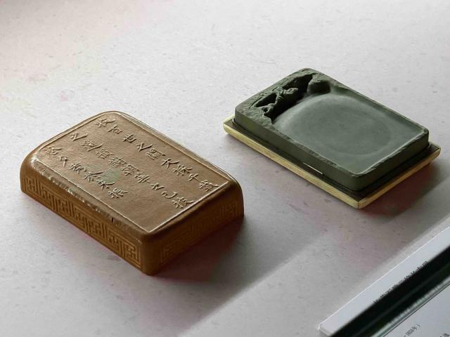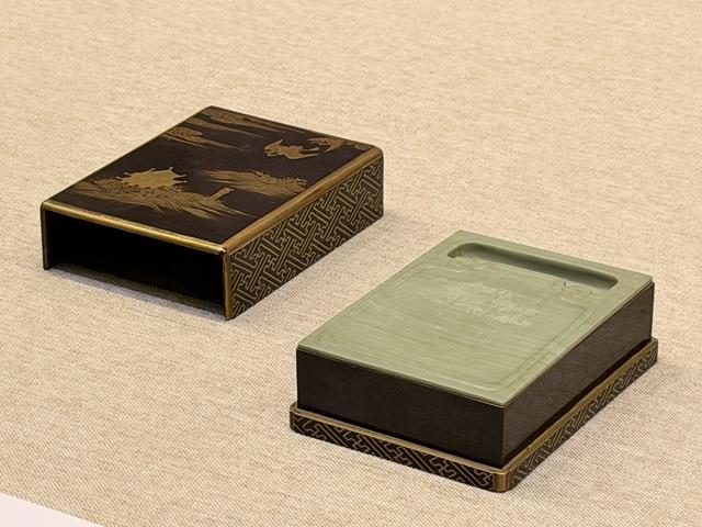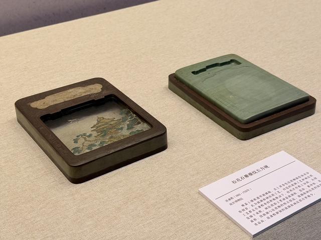 在展厅柔和的光线下,松花石雕提梁罐纹长方砚散发着独特韵味。大漆盒身用金描画出飞鹤与海上仙宫,与砚身的浮雕提梁纹相得益彰,彰显出工匠的精湛工艺。不远处,另一方同为雍正年间的松花石长方砚,以纯粹的石质肌理引人注目,松花石细腻光洁,在简洁造型中展现出石材本身的质感,与提梁罐纹长方砚相互映衬,各有风姿。