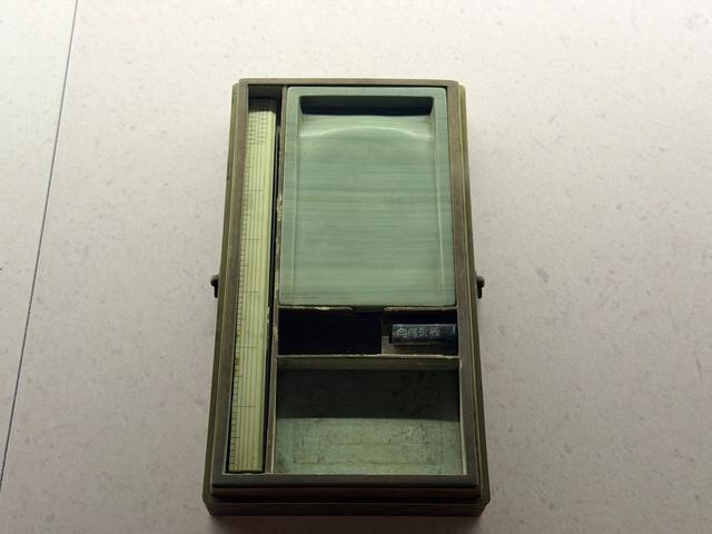 道光年间的松花石雕云纹长方砚虽为晚清制品,工艺水准却丝毫不减。砚面开斜通式砚池,砚额雕琢云纹,砚背刻有“道光御赏”四字,砚盒更是十分考究,盒盖为匏质,盒底为紫檀木嵌牙边框,显示出御用物品的精致与尊贵。