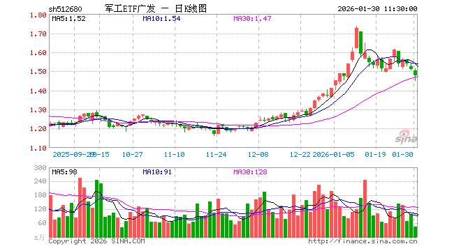 1月30日,截止午间收盘,军工ETF广发(512680)跌1.99%,报1.479元,成交额6579.24万元。军工ETF广发(512680)重仓股方面,中国船舶截止午盘跌2.78%,光启技术涨1.57%,航天电子跌0.04%,中国卫星跌1.90%,航发动力跌3.20%,中航沈飞跌0.85%,中航光电跌0.78%,航天发展涨6.88%,菲利华涨2.18%,睿创微纳跌2.48%。