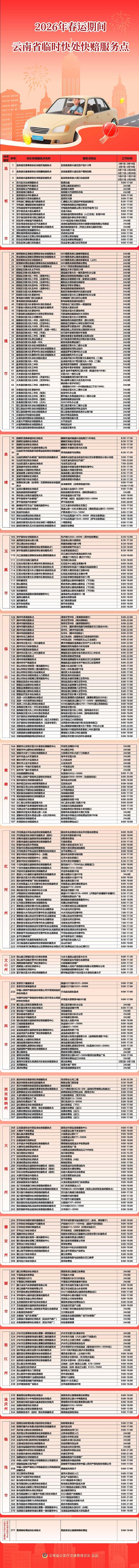 2026年春运将于2月2日拉开帷幕,为确保云南省2026年春运期间道路交通安全畅通,保障群众便捷平安出行,云南交警联合保险机构共同在高速公路、重点国省干道及热点旅游沿线的服务区、收费站及交通警察执法站等场所设置道路交通事故快处快赔临时服务点371个,为春运期间群众出行提供便捷、高效的道路交通事故认定、定损、理赔等道路交通事故快处快赔服务。