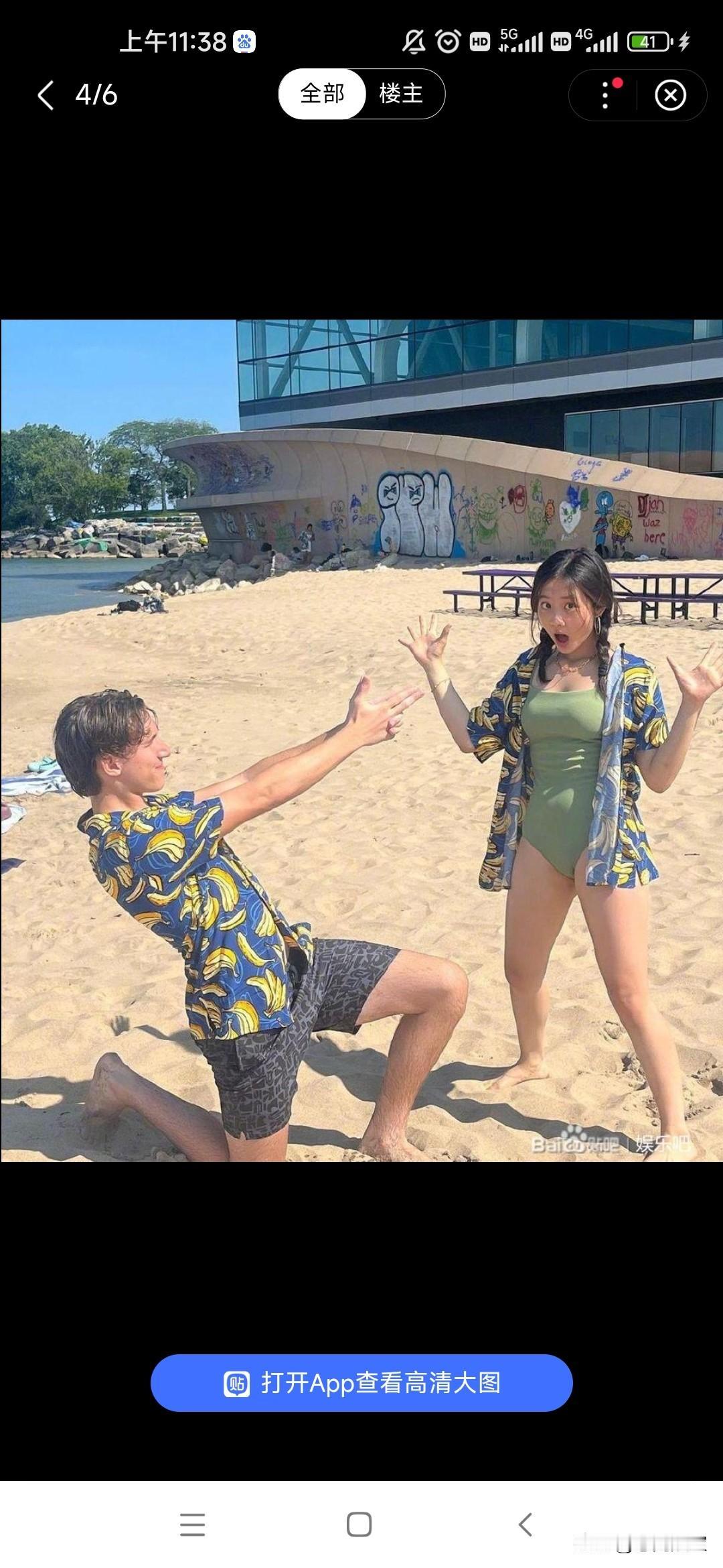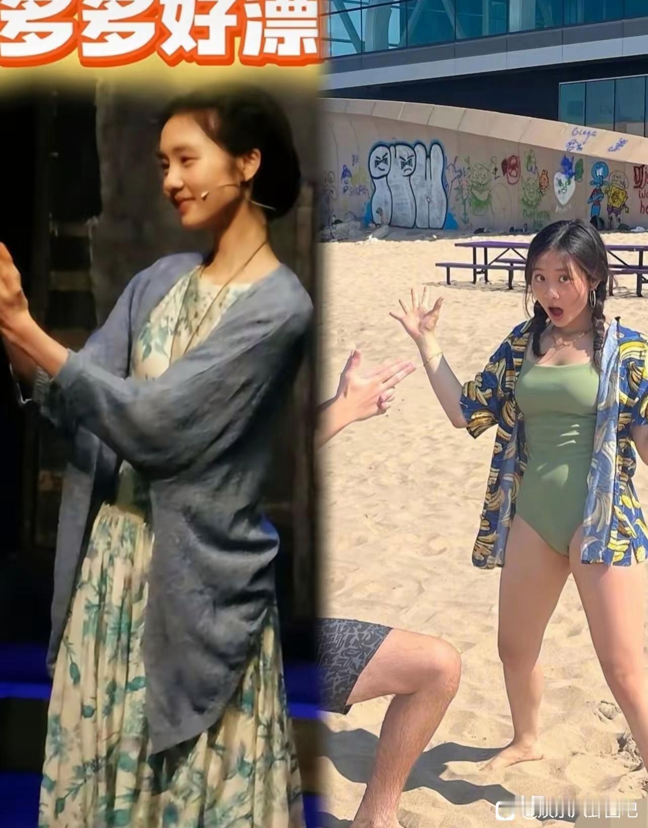 你们有没有觉得, 黄多多换个环境, 就像换了一种打开方式, 就像变了个人一样, 一开始看到这两张照片, 差点没认出是同一个人, 一边是在国内参加话剧的样子, 照片里的黄多多一身素雅碎花长裙,外塔浅蓝色开衫,头发盘的整整齐齐,举手投足间非常端庄大方有气质, 低眉浅笑,侧颜温婉动人,带着非常难得的中式温婉的书卷气, 18岁的黄多多生的婷婷玉立,完美的遗传到了母亲孙莉的颜值,惊艳的同时气质也很优雅, 站在舞台上,就有一种鹤立鸡群的故事感, 黄多多长得非常有观众缘,要是去演电视剧,简直就是大爆的资质。 到了美国的海滩上, 直接是另一种画风, 紧身绿色泳衣配花色衬衫, 对着镜头比夸张搞怪的pose,简直是放飞自我,让人大跌眼镜,不忍直视, 原本沉静优雅的气质也变的轻浮起来, 当然现在是21世纪, 穿个泳衣也非常正常, 只是和在国内的形象差距太大了些, 有些割裂, 你们觉得呢?