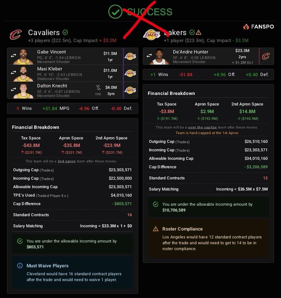 这笔交易必须同时满足薪资匹配合规和土豪线合规两大要求。即便湖人接收的薪资比送出的多出部分未超97.7万美元,骑士接收的薪资也未超送出的亨特2330万美元基础薪资,只要亨特的非保障性激励奖金会导致湖人薪资突破第一土豪线,这笔交易就不具备合法性。