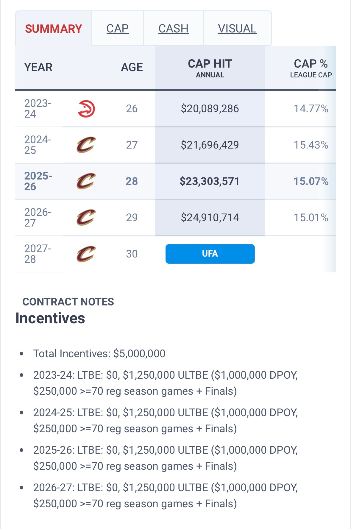 亨特合同中包含125万美元的非保障性激励奖金,因上赛季均未达成,被归为“大概率无法获得”类别,具体包含100万美元的最佳防守球员奖金,以及25万美元的出场超70场且球队打入总决赛的奖金。该类奖金在未触发前,不计入球队常规工资帽,但会纳入土豪线合规计算;