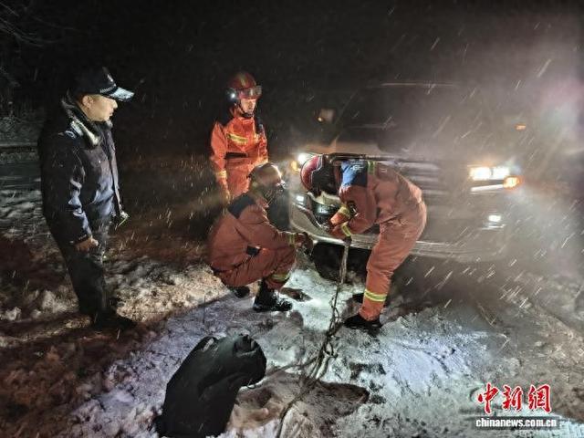 2时许接到报警电话后,灵石县消防救援大队14名消防员分乘2辆消防车出警。由于室外气温低至-10℃且能见度只有十几米,消防车行进速度较慢。好不容易赶到事发坡道下方后,即便消防车轮胎加装了防滑链也无法爬坡,消防员只能携带绳索等救援器材徒步爬坡。