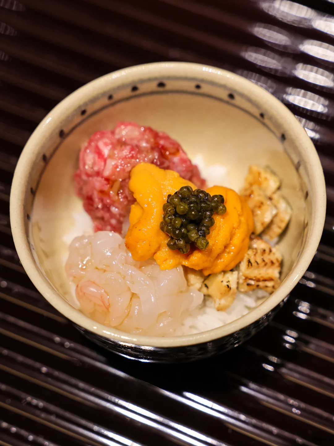 和第一次有点类似,用许多料堆在米饭上自制寿司饭,不同的是多了海胆、鳗鱼和鱼子酱,整体拌匀之后是较为浓稠的海鲜饭,再带点牛肉的奶香。
