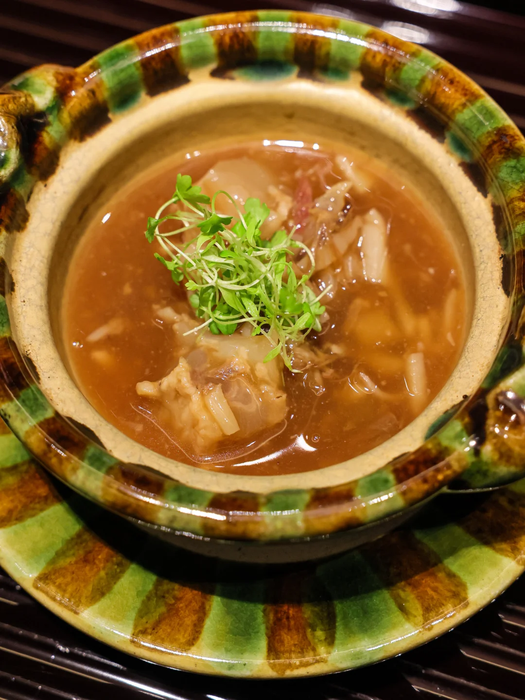 开场是一碗胶质感拉满的牛高汤。牛窝骨肉的胶质下面还带点肉丝,回味有一点胡椒的辣味,非常暖身子!